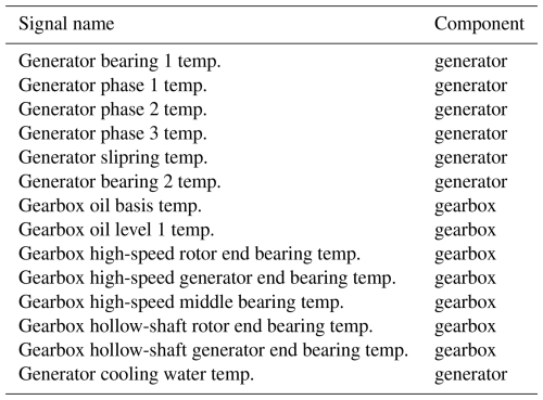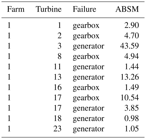The industrial partners provided a list comprising 22 failures deemed relevant for this study, including 9 gearbox failures and 13 generator failures. Failures were identified by the industrial partners at the time of occurrence, and their nature was subsequently determined through inspections of the failed components. The gearbox failures were primarily caused by bearing damage, representing relatively conventional cases for which SCADA-based condition monitoring techniques are well established. In contrast, the generator failures involved electrical short circuits. These cases are more challenging to detect, as the failures are electrical in nature and can only be observed indirectly through the warming of certain generator components like the phases. At the time of writing, the exact root causes of the generator failures remain unknown.