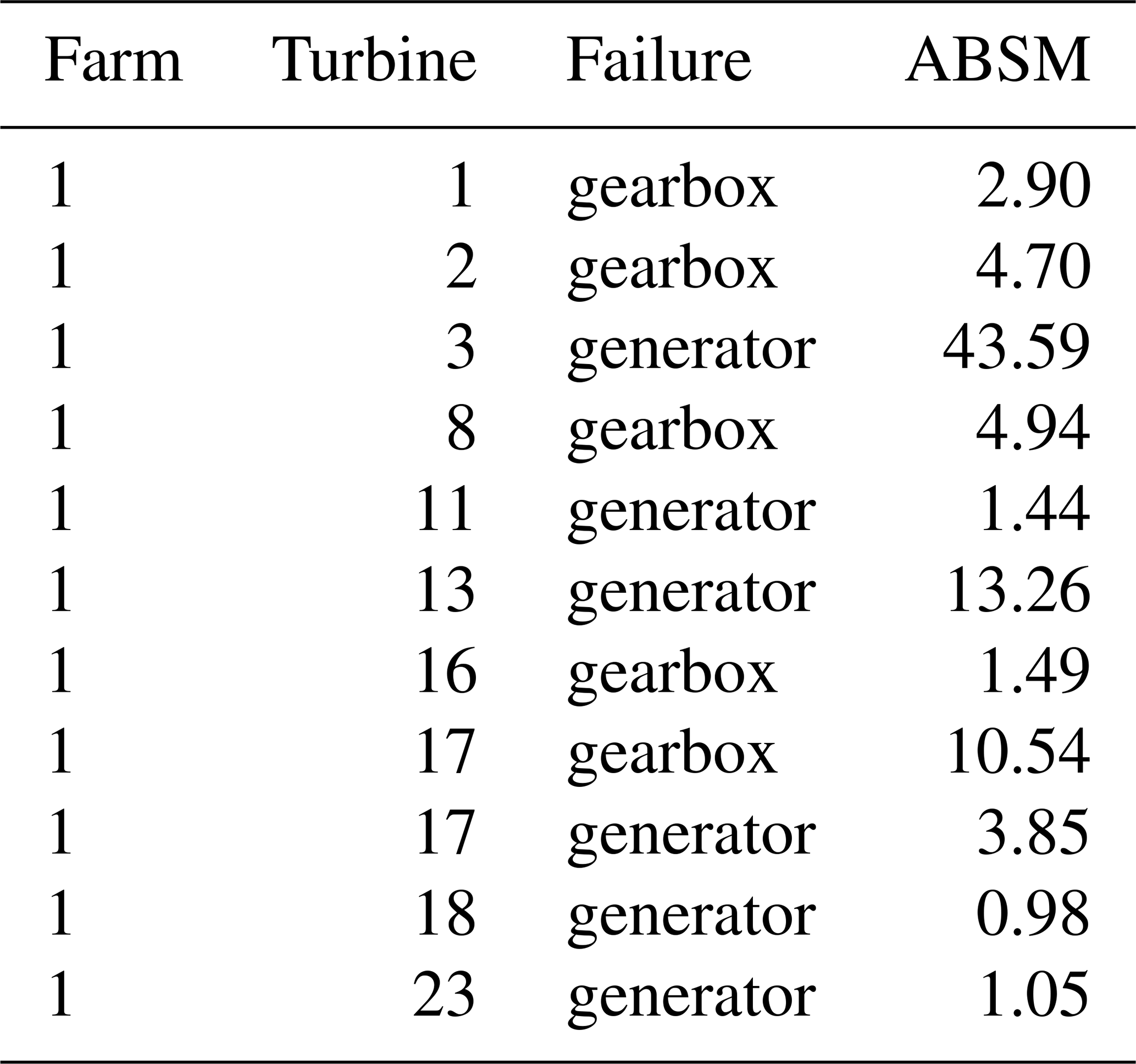 During the observation period, the wind turbines under study experienced several types of failures. Based on feedback from industrial partners and their assessment of the economic relevance of each failure type, the methodology is validated on generator and gearbox failures. These failures occurred relatively frequently within the wind farm and were associated with long downtimes; outages exceeding 1 month were not uncommon. In all cases, the failures resulted in complete replacement of the affected component, which is a non-trivial operation given the size and complexity of these components.