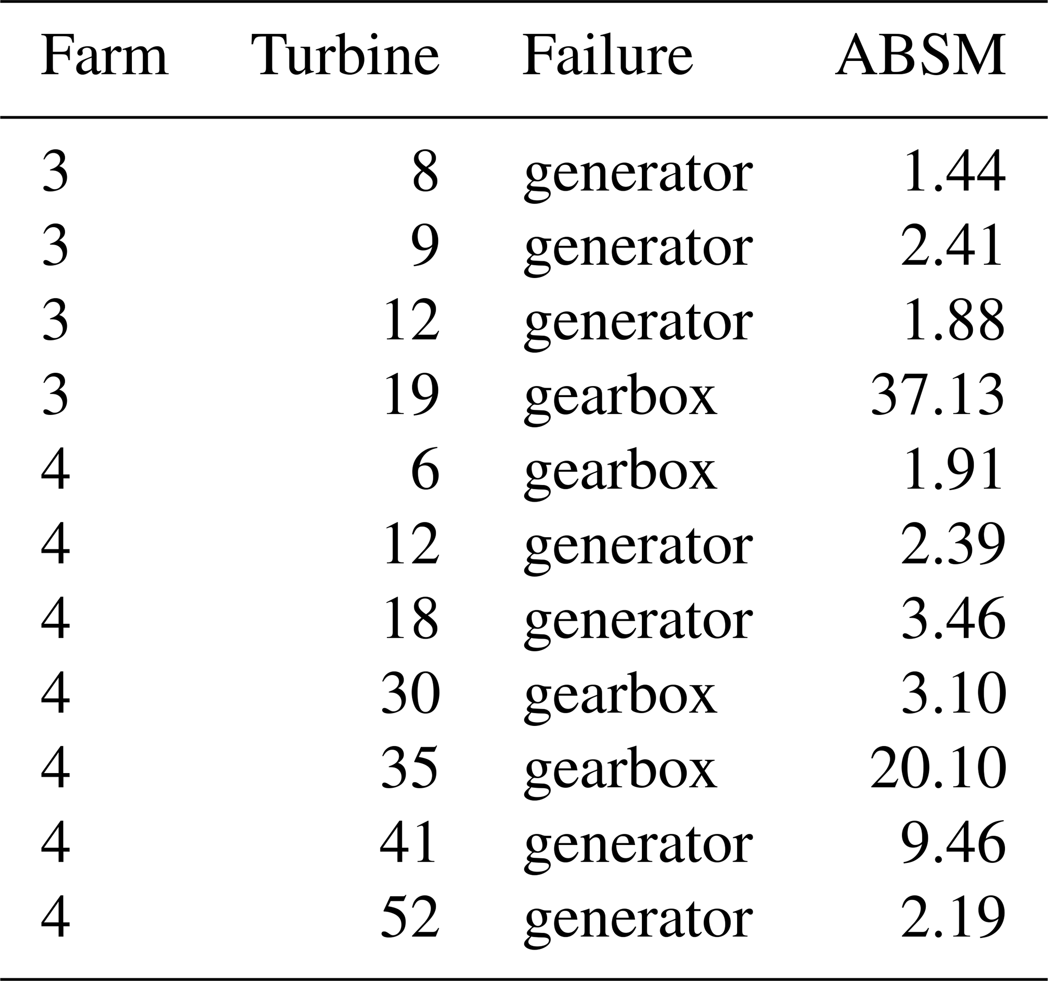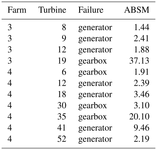To obtain a general assessment of the value of the model as NBM, we validate it on historical failure data from operational offshore wind farms. For three of the four wind farms described in the Methodology section, industrial partners provided lists containing the turbine ID, timestamp, and failure type. Validation is performed using the ABSM metric (see Methodology section). A strong NBM should yield ABSM values substantially greater than 1 for the component that ultimately fails. In total, 22 drive-train-related failures were evaluated: 9 gearbox failures and 13 generator failures. These failures were provided by the industrial partner. They constructed the list based on post-failure inspections of the components. The results for wind farm 1 and wind farms 2 and 3 are presented in Tables 3 and 4, respectively.