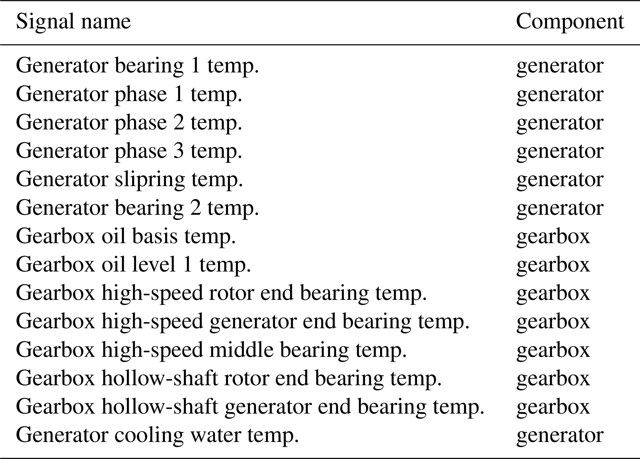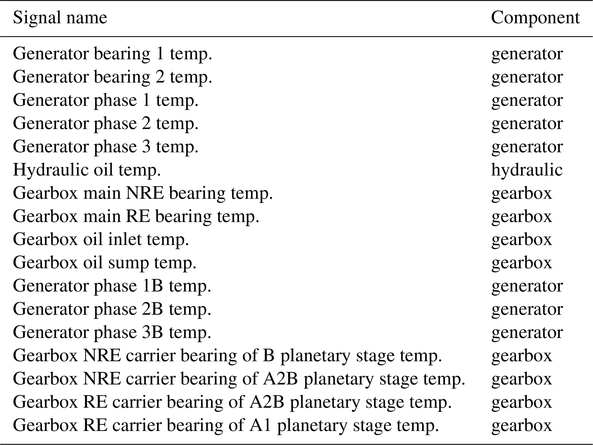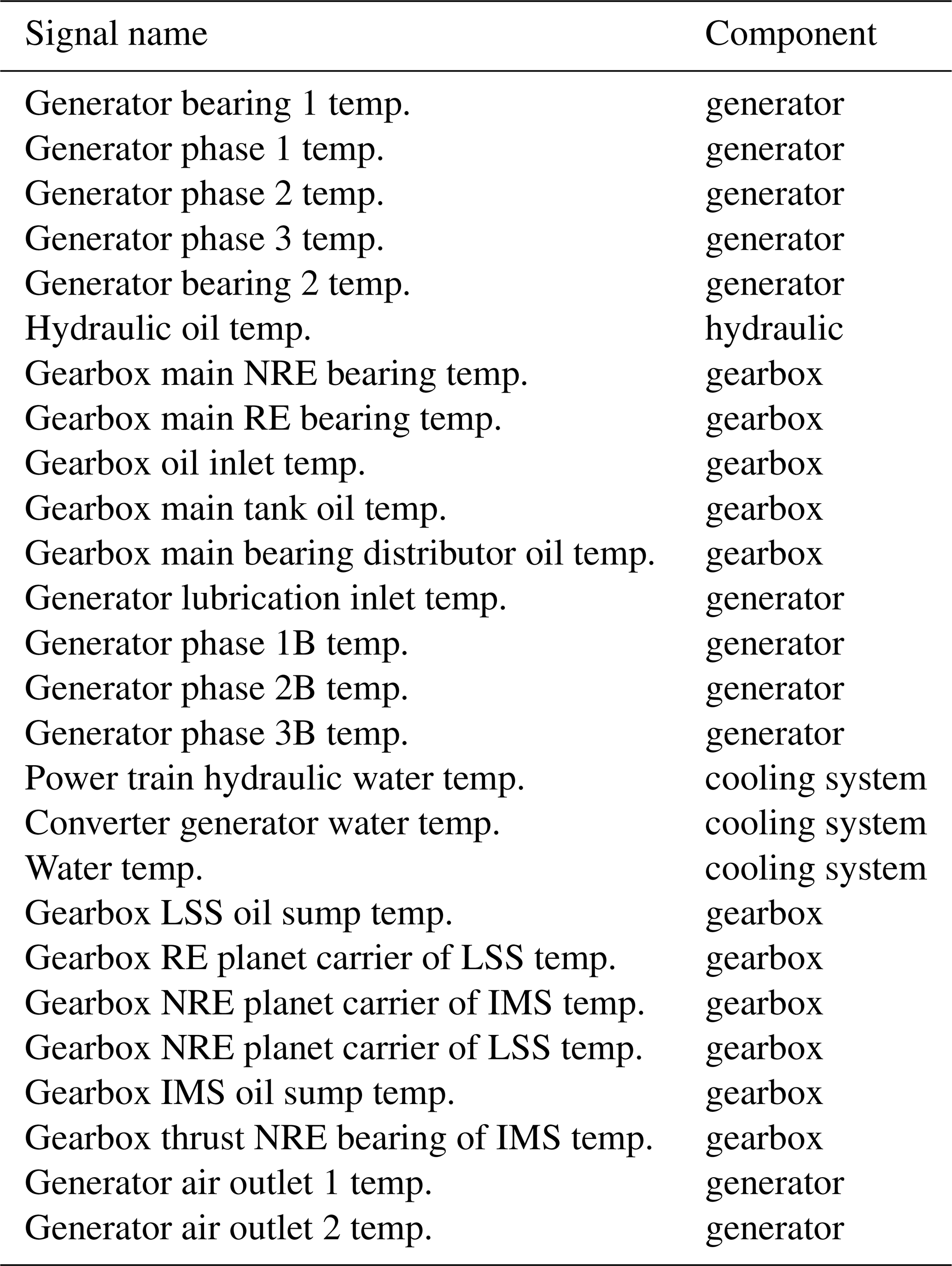 The sensor errors occur across a broad range of sensors, including hydraulic oil temperature sensors, gearbox oil sump temperature sensors, gearbox A2B planet non-rotor-end (NRE) carrier bearing temperature sensors, gearbox A2B planet rotor-end (RE) carrier bearing temperature sensors, generator phase 3B temperature sensors, generator air outlet 1 temperature sensors, gearbox A1 planet NRE bearing temperature sensors, gearbox A2 planet RE bearing temperature sensors, gearbox B planet NRE carrier bearing temperature sensors, the nacelle temperature sensor, and generator slip-ring temperature sensors.