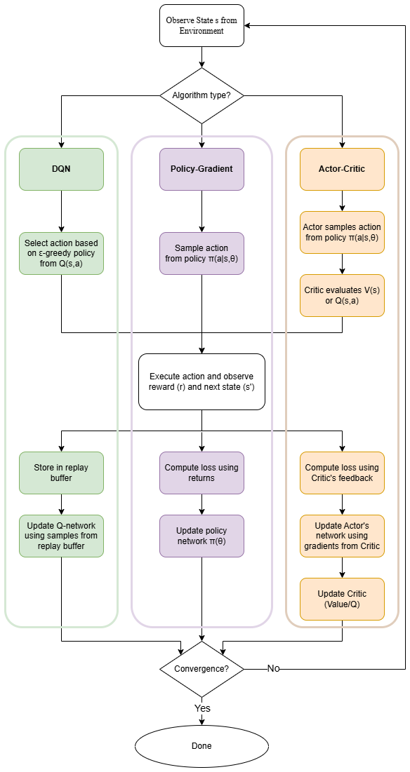 The flowchart in Fig. 2 illustrates these single-agent DRL approaches: all methods share common initial steps (environment setup, state observation) before diverging by learning logic – DQN (green) selects actions via ϵ-greedy exploration based on Q values, policy-gradient methods (purple) sample actions from a learned distribution and update directly via performance gradients, and actor-critic methods (orange) use a critic network to evaluate actions and guide policy improvement.