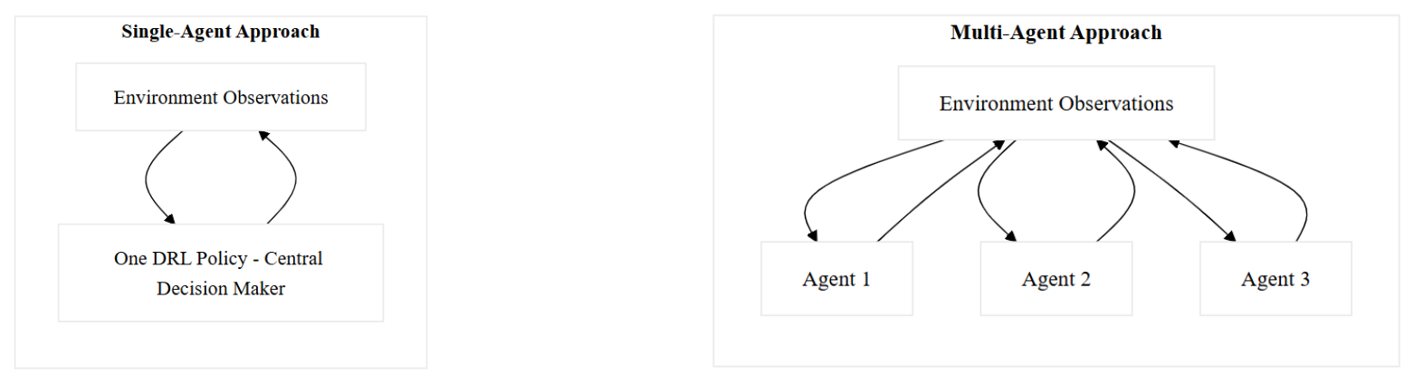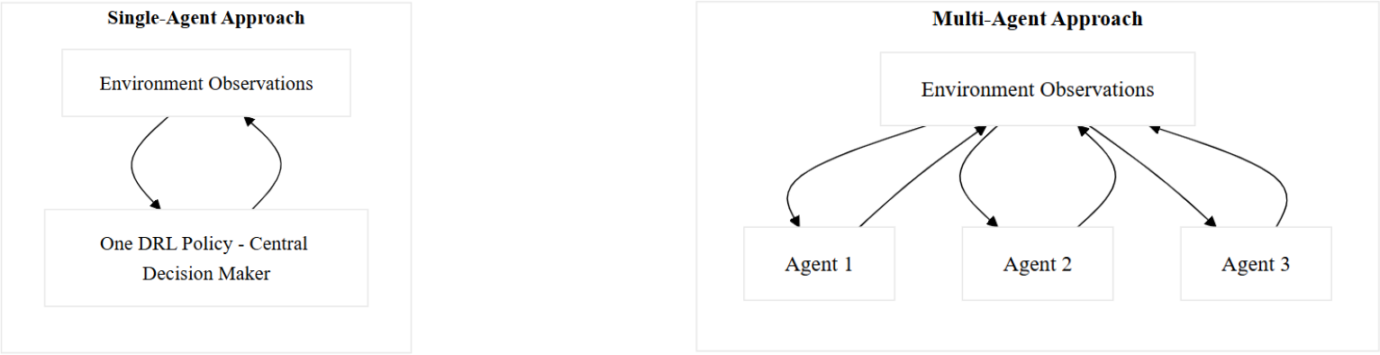 Figure 3Comparison of single-agent and multi-agent deep reinforcement learning approaches.