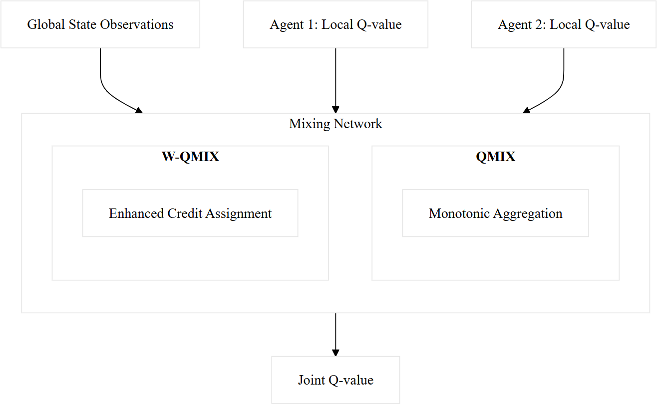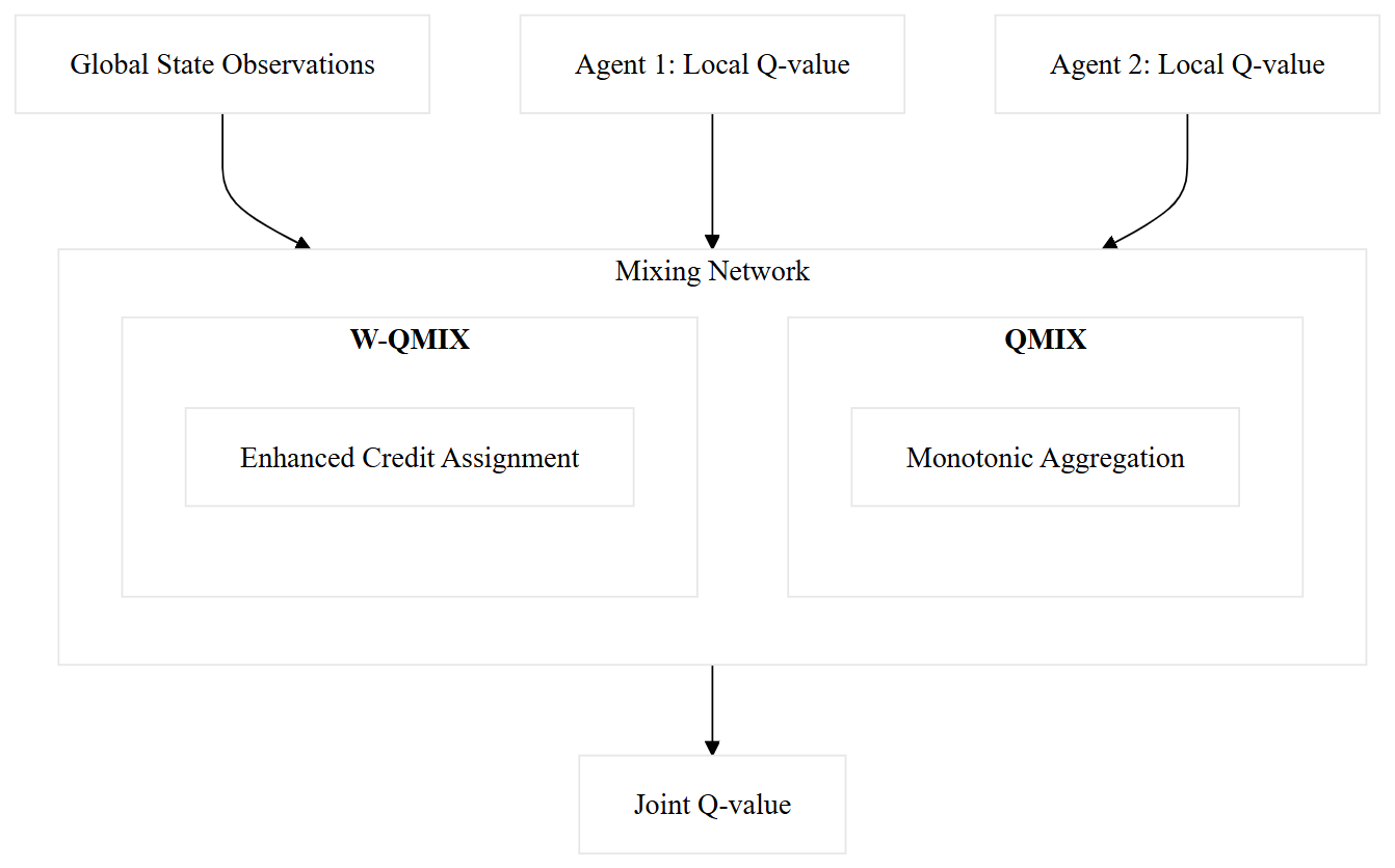 Figure 4 presents a high-level overview of how local Q values from multiple agents are combined into a single joint Q value through a central mixing network. At the top, global state observations and individual agents’ local Q values feed into the network. Within the mixing network, these local estimates are merged. The output at the bottom is a single joint Q value, enabling decentralized agents to learn coordinated policies that account for global objectives.