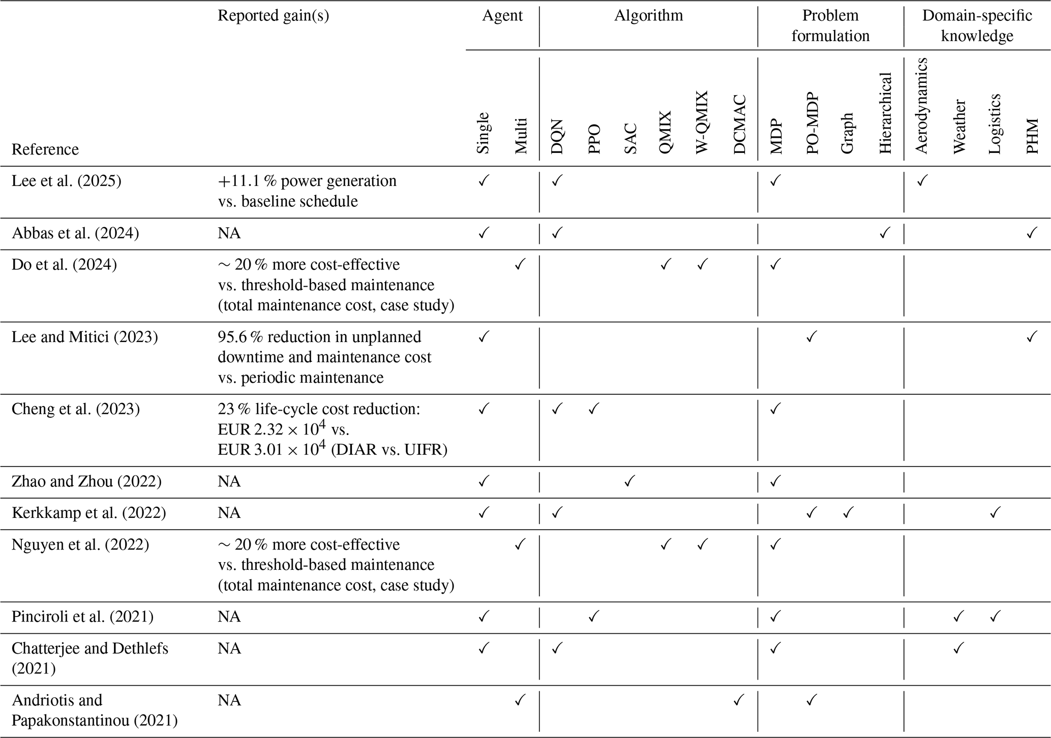 The remainder of this paper is organized as follows. In Sect. 2, we review single-agent DRL approaches for offshore wind maintenance, highlighting key algorithms and their performance in various decision-making settings. Section 3 extends the discussion to multi-agent DRL frameworks, which address scalability by distributing decisions across multiple agents. In Sect. 4, we detail the formulations used to represent the maintenance problem, including Markov decision processes (MDPs), partially observable MDP (POMDP), and hierarchical and graph-based methods. In Sect. 5 we discuss the applications of DRL and the integration of domain-specific knowledge, such as wind farm aerodynamics, weather constraints, logistics, and PHM data, and finally offer a recap of the reviewed models, schematizing their key features in a summary table. Section 6 summarizes the key contributions and performance improvements achieved by the reviewed DRL models, and we also compare simulation-based studies with real-world applications and discuss the integration of nuanced repair types in the models. In Sect. 7 we focus on what we believe is the main gap in current DRL models for maintenance planning, i.e. their reliance on a binary maintain-or-not decision. Instead, we argue that incorporating multiple levels of repair actions is necessary to reflect real-world maintenance scenarios more accurately. Finally, Sect. 8 concludes with insights and directions for future research.