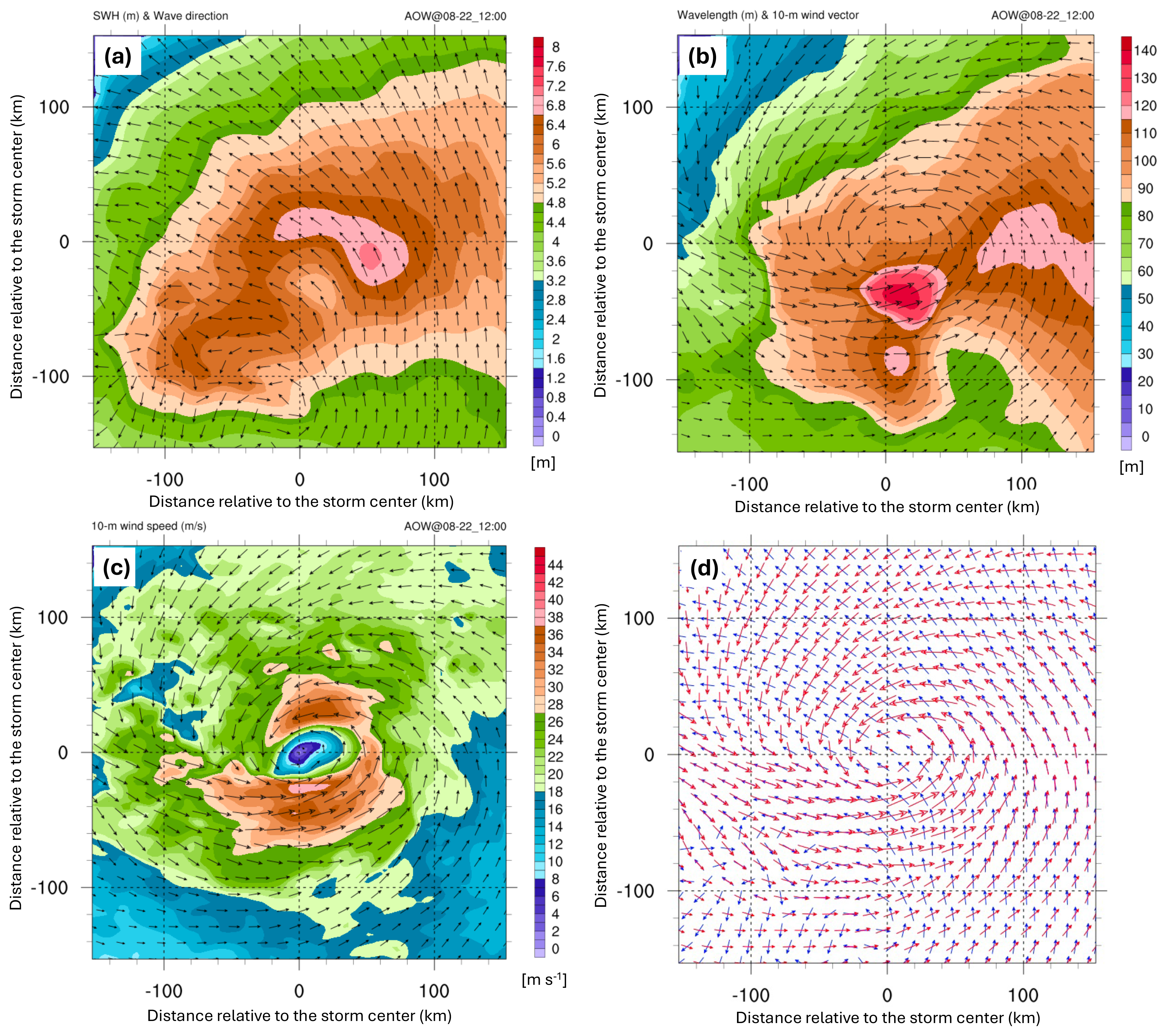 Figure 10The fully coupled model output at 12:00 UTC on 22 August 2021 includes (a) significant wave height (shaded; in meters) and wave direction, (b) mean wavelength (shaded; in meters) and 10 m wind, (c) 10 m wind speed (shaded; in m s−1) and vectors, and (d) wave (blue) and wind (red) vectors. All plots are in a 300×300 km storm-centered domain, with a 20 m s−1 reference wind vector shown in panels (b) and (c).
