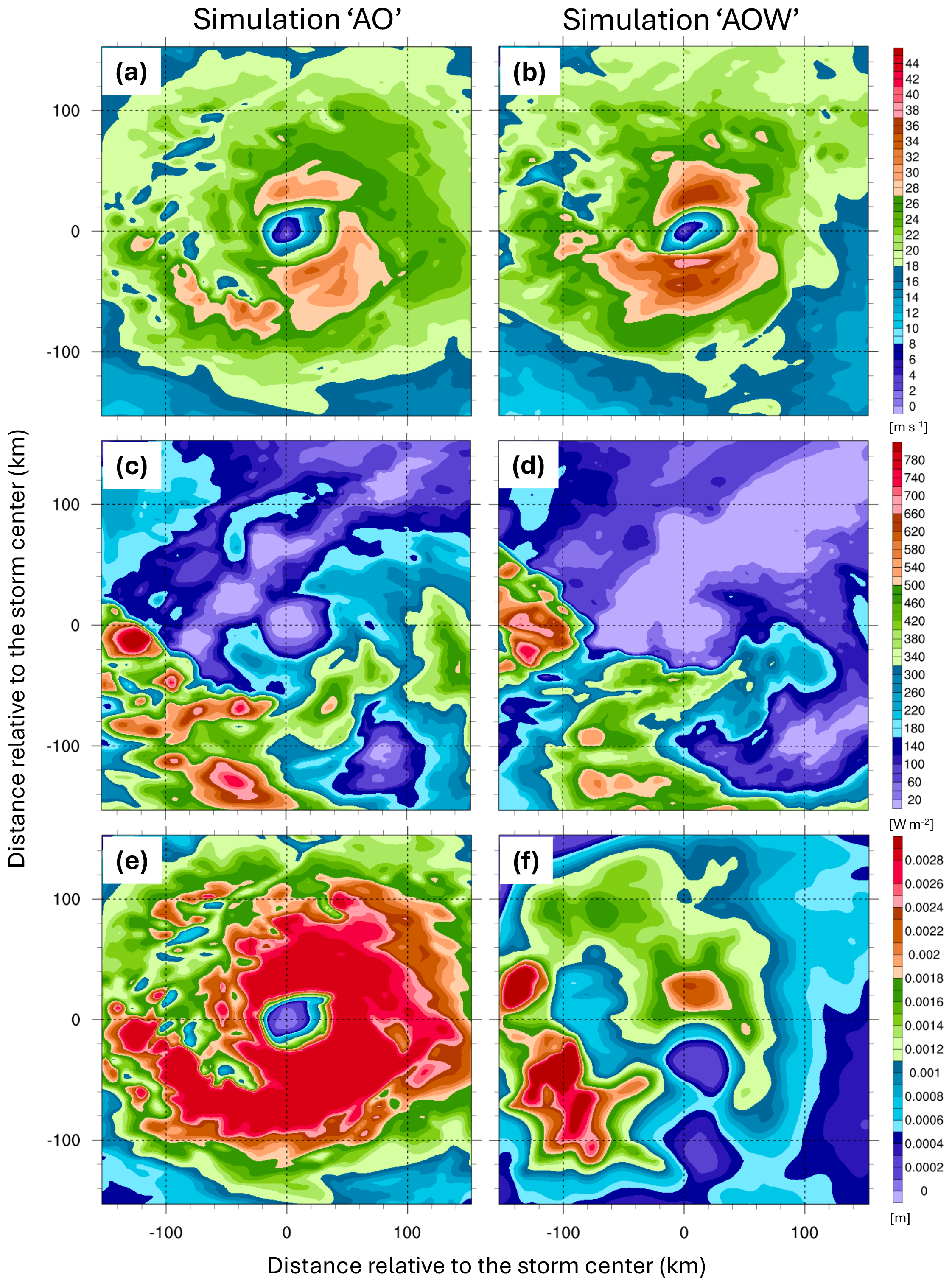 Figure 11Distribution of (a–b) 10 m wind speed (m s−1), (c–d) surface enthalpy flux (W m−2), and (e–f) surface roughness length (m) derived from experiment “AO” (left column) and experiment “AOW” (right column) at 12:00 UTC on 22 August 2021. All distributions are displayed in a 300 km × 300 km storm-centered coordinate.