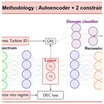 While auto-encoder frameworks provide a means to derive compact and informative embeddings, such representations often retain individual turbine biases when transferred across different assets. In wind farms, for example, turbines exhibit subtle yet systematic variations in resonance, foundation stiffness, or sensor placement, which can be encoded in the latent space. This challenge is central to the emerging field of population-based structural health monitoring (PBSHM) (Bull et al., 2020), where the objective is to transfer knowledge across a fleet of nominally identical structures while accounting for their inherent variability. In this context, the encoder–decoder can be interpreted as learning a population form (a unified functional representation that captures the essential operational dynamics shared across turbines while tolerating structured variability between them). Such a form provides a common reference against which future measurements can be assessed, enabling consistent operational inference across the fleet. One prominent solution for learning such a unified functional representation is domain-adversarial learning., which explicitly enforces invariance to domain differences. The domain-adversarial neural network (DANN) (Ajakan et al., 2014) extends the adversarial training paradigm of generative adversarial networks (GANs) to representation learning by coupling the main task with a domain classifier connected through a gradient reversal layer. This forces the encoder to produce embeddings that are expressive for the main task while remaining indistinguishable across domains (i.e., different turbines). Building on this principle, recent studies have demonstrated the versatility of DANN in vibration-based monitoring: Mao et al. (2020) achieved improved transfer performance in bearing fault diagnosis under variable working conditions with a structured DANN, Li et al. (2025) proposed a partial conditional adversarial network to transfer damage knowledge from numerical models to full-scale structures, and Li et al. (2023) applied DANN to bridge monitoring by aligning finite-element simulations with field data. Similarly, Martakis et al. (2023) fused domain adaptation with feature engineering to classify unseen damage states in shake-table tests of real buildings. Collectively, these applications underscore the potential of adversarial domain adaptation for mitigating domain shifts in SHM tasks. However, its application to operational state inference in wind turbines – where turbine-specific biases are particularly pronounced – remains unexplored. Beyond adversarial approaches such as DANN, PBSHM has also explored alternative alignment strategies such as balanced distribution adaptation (BDA) (Gardner et al., 2022), although these methods are typically applied to the transfer of diagnostic knowledge, whereas our focus is solely on learning domain-invariant embeddings without transferring damage labels.