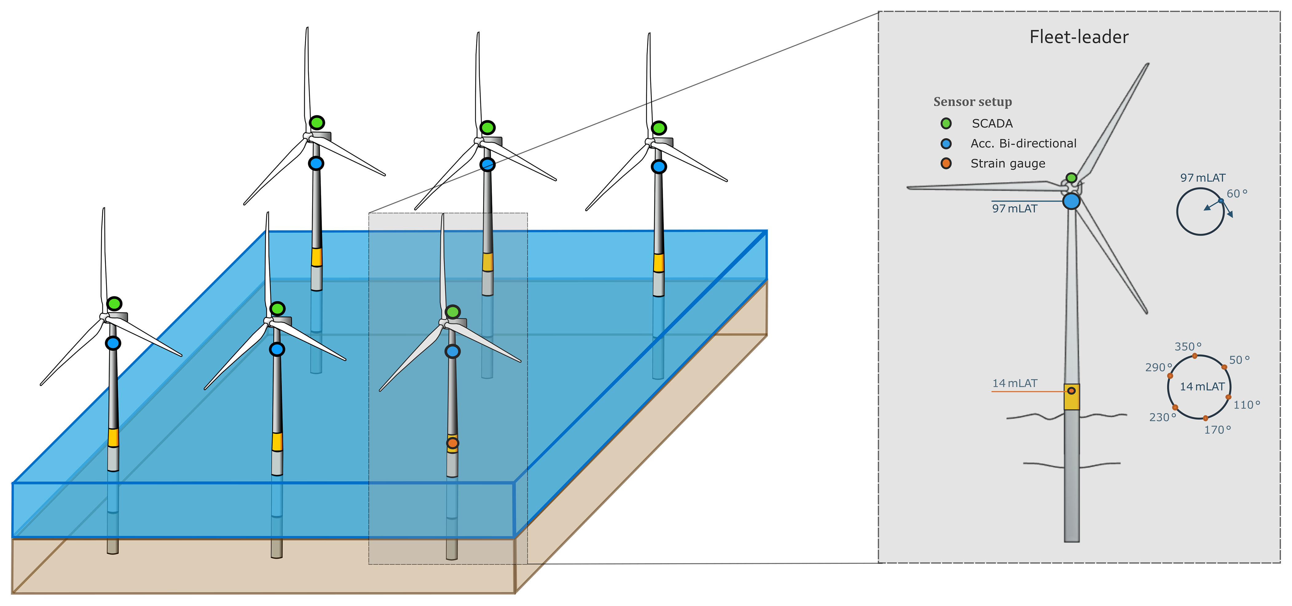 Figure 1Schematic of the offshore wind farm and sensing layout: nacelle accelerometers (blue) provide high-frequency vibration data used for learning operational embeddings, and SCADA signals (green) provide supervisory and control measurements used only for evaluation and interpretation. Tower/monopile strain gauges (orange) are installed on a small subset of turbines – so-called fleet leaders.