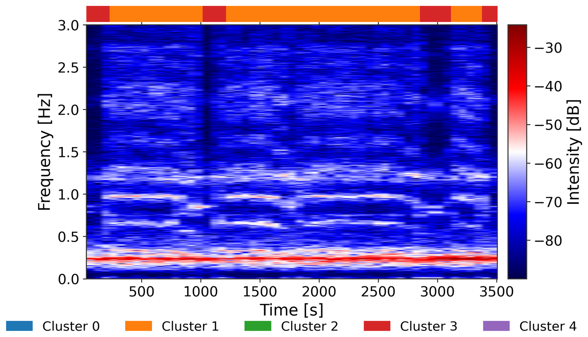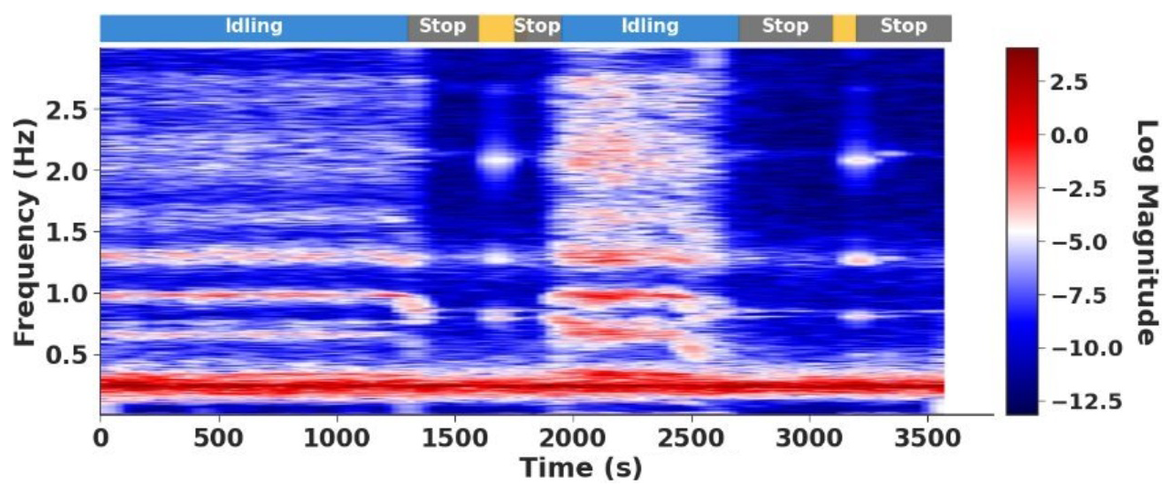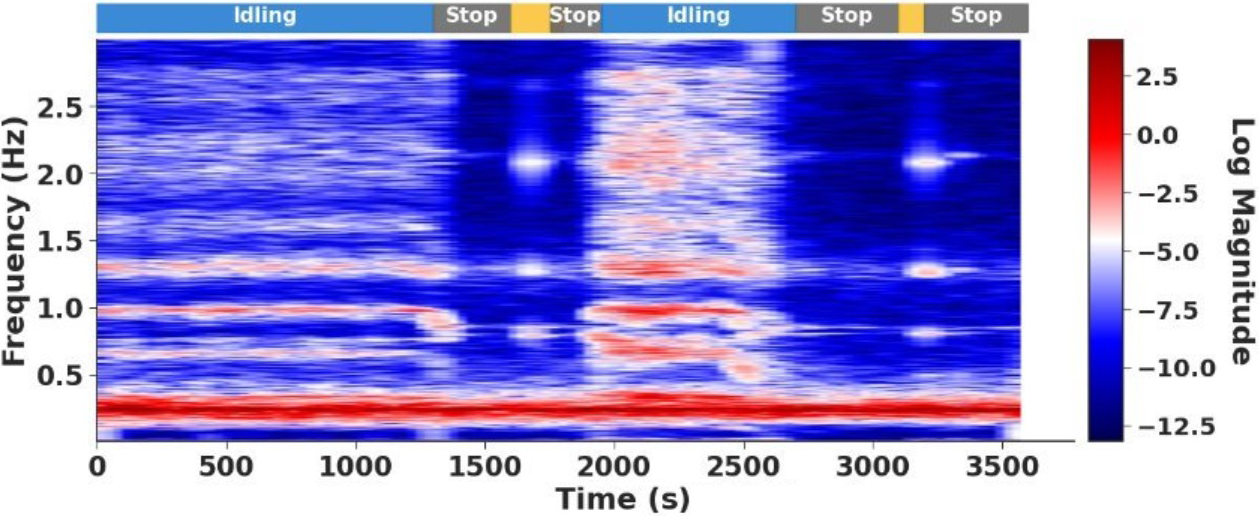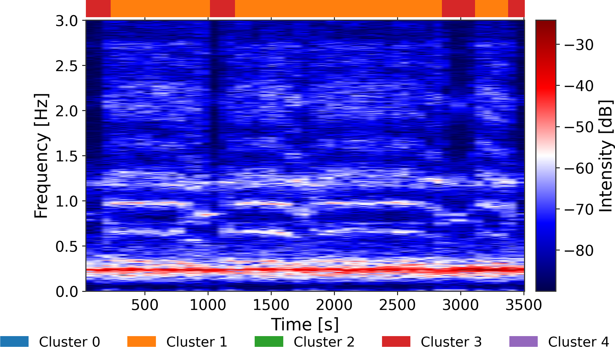 Figure 2Log amplitude spectrogram (0–3 Hz) of turbine acceleration with state sequence inferred from vibrations.