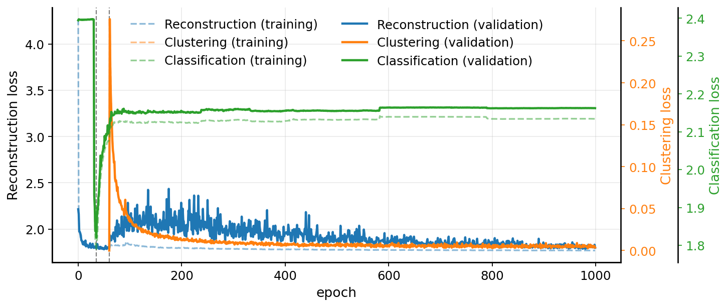 All network parameters were optimized using the Adam optimizer (Kingma and Ba, 2014), with an initial learning rate of . The learning rate was adapted using a ReduceLROnPlateau scheduler (reduction factor of 0.2, patience of 5, minimum learning rate of 10−5), monitored on the basis of the validation reconstruction loss. A batch size of 1024 was used throughout. To ensure stable optimization, gradient clipping with a maximum ℓ2 norm of 1.0 and early stopping with a patience of 50 epochs were applied.