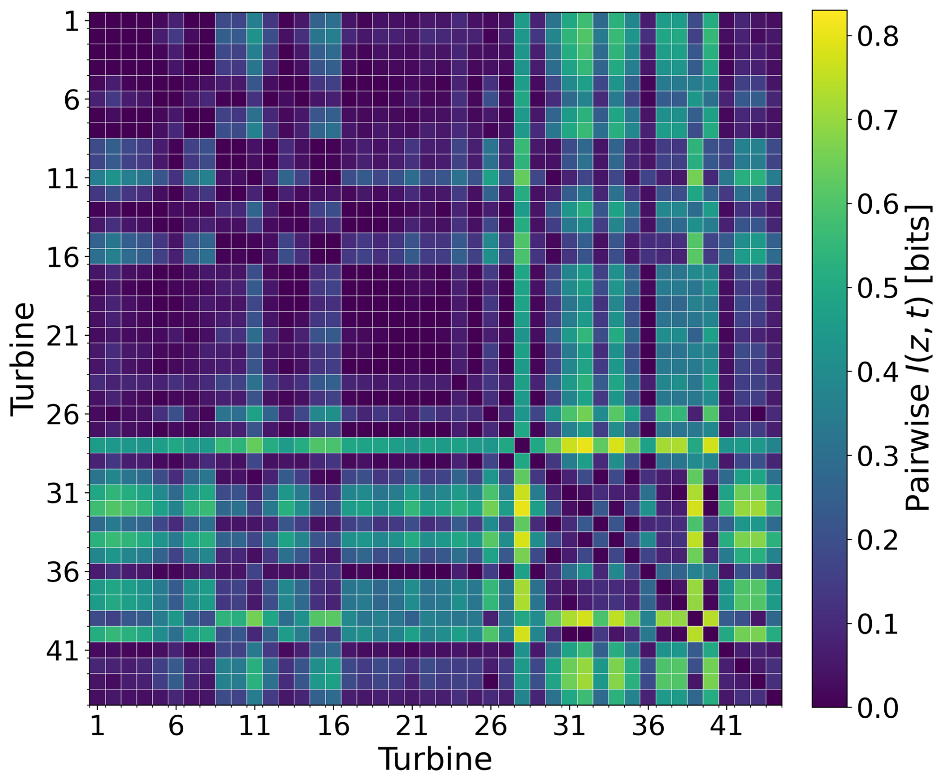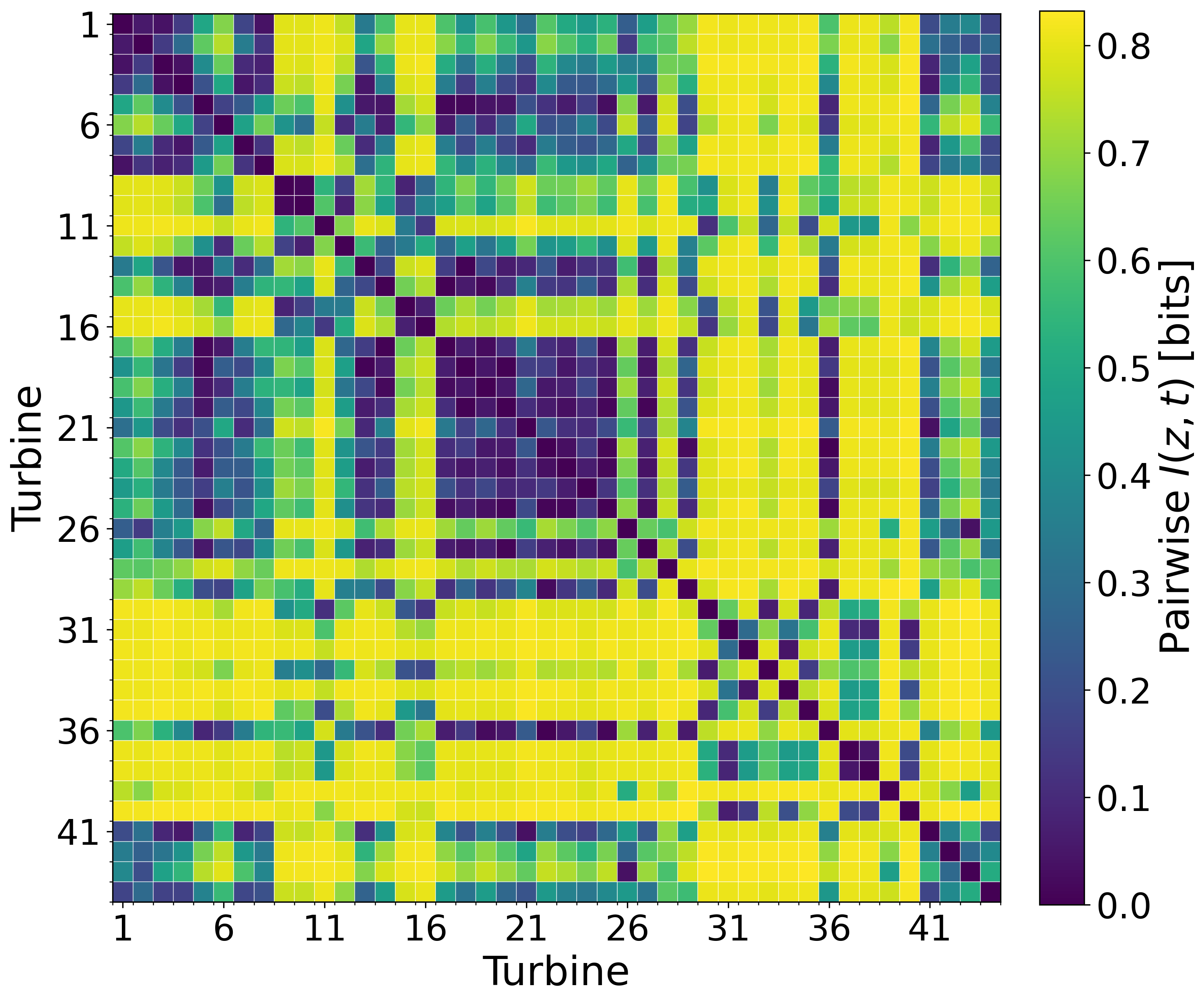 Clustering was performed directly on the precomputed turbine × turbine matrix D, which encodes pairwise dissimilarity derived from mutual information (MI) between turbine identity and embeddings. Larger entries in D indicate lower similarity (stronger turbine-specific signatures), the matrix is symmetric with a zero diagonal, and units are bits.