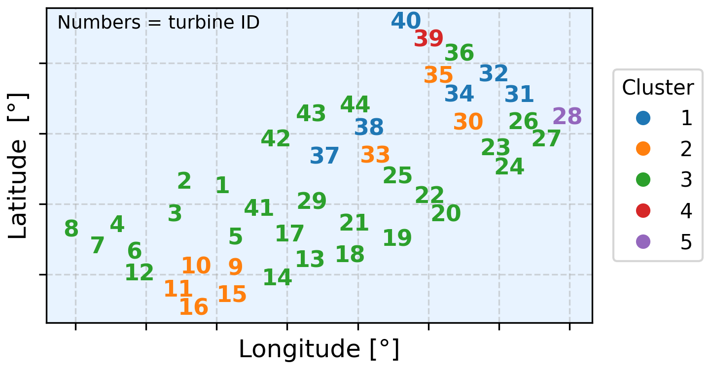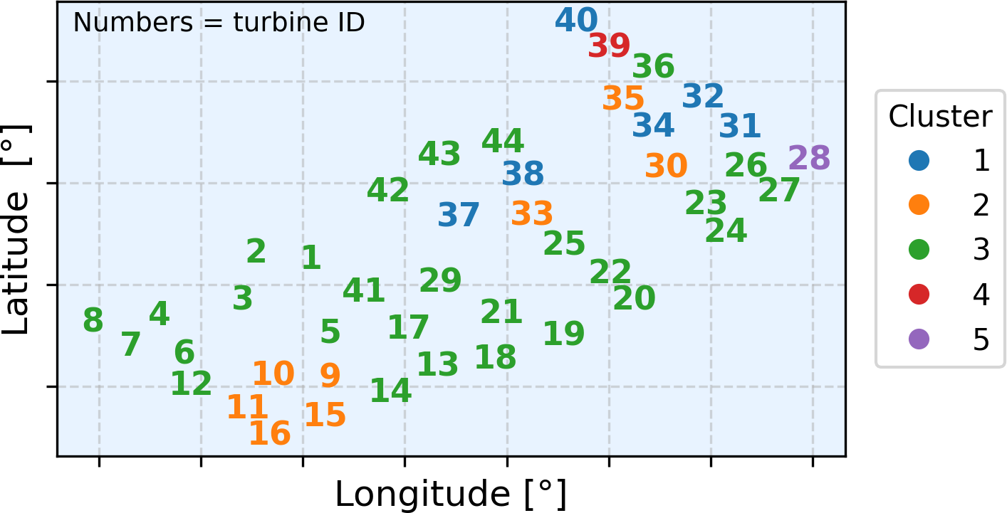 In Fig. 6, the geographic layout of the wind farm is shown, with colors indicating the clusters obtained; numbers correspond to anonymized turbine identifiers. The map was examined to verify that the clustering was not a by-product of wake geometry or simple row positioning (front versus back turbines). No systematic alignment or consistent relation with water depth was observed. The clusters nevertheless appeared to be structured rather than random yet could not be explained by straightforward spatial factors. It is therefore inferred that the grouping most likely reflects a combination of site-specific conditions, control strategies, or structural variability not captured in the available metadata.
