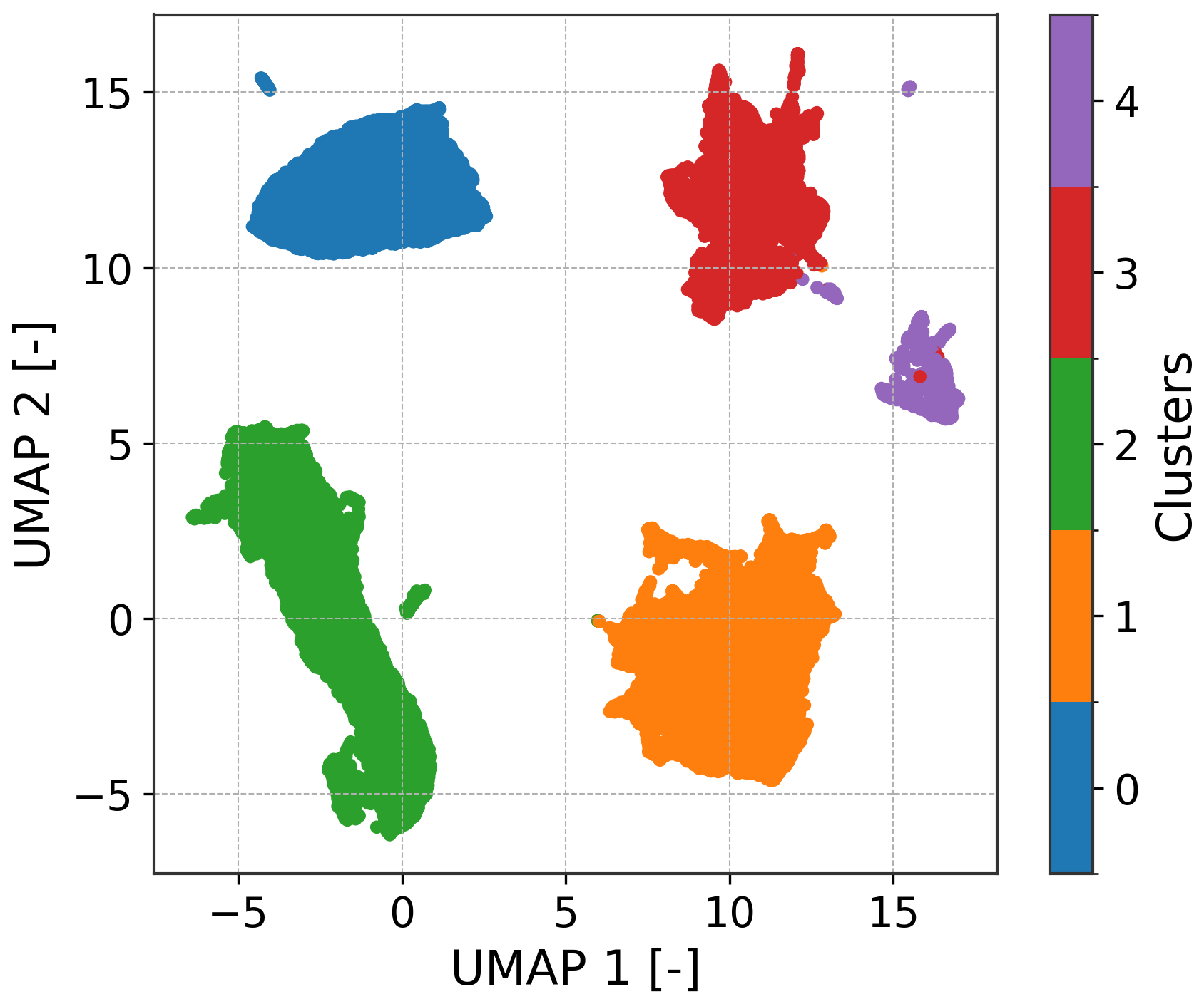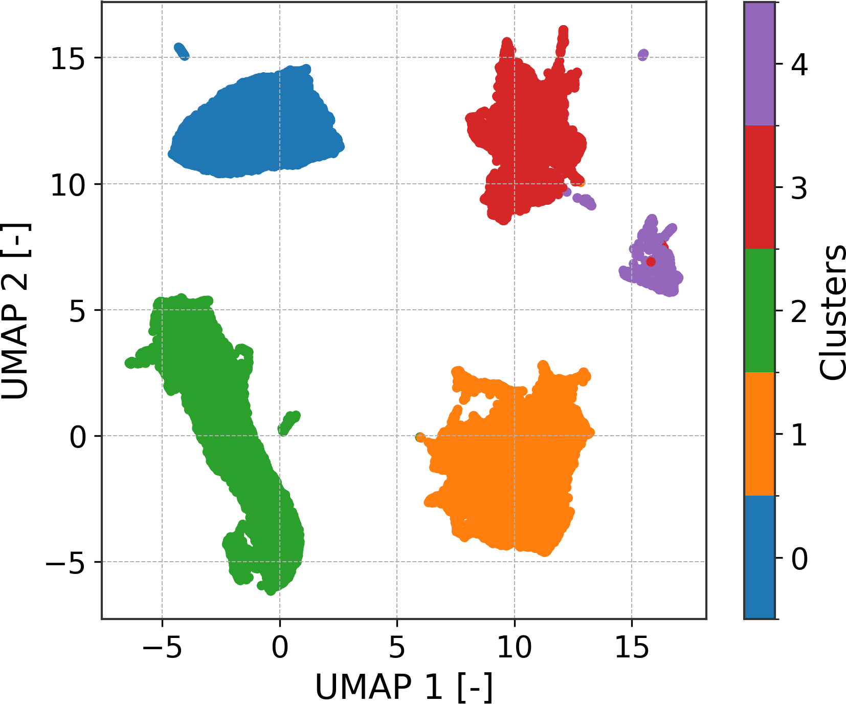 Figure 7UMAP projection of the latent space colored by discovered clusters. The partitioning yields coherent operational regimes.