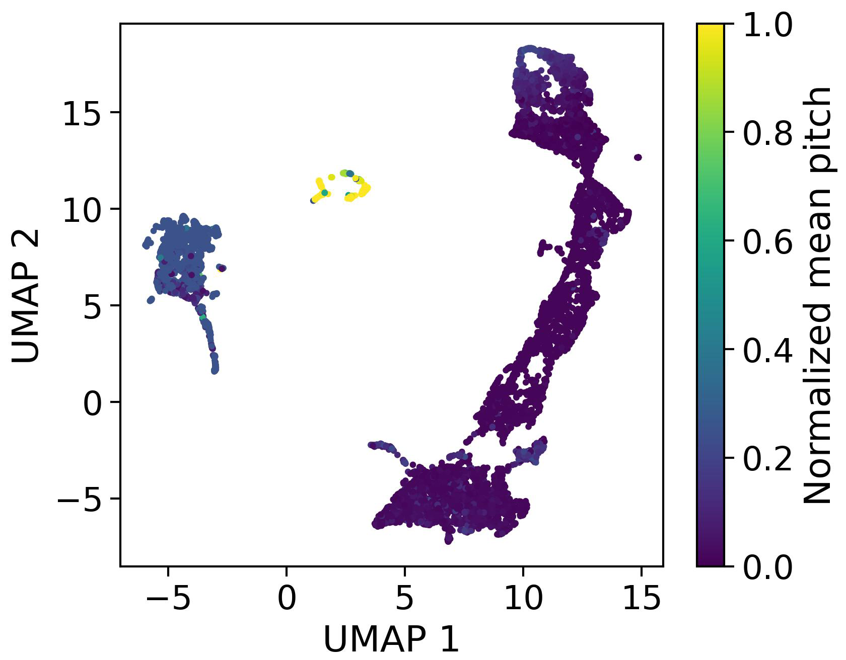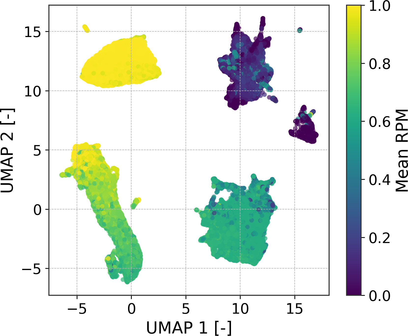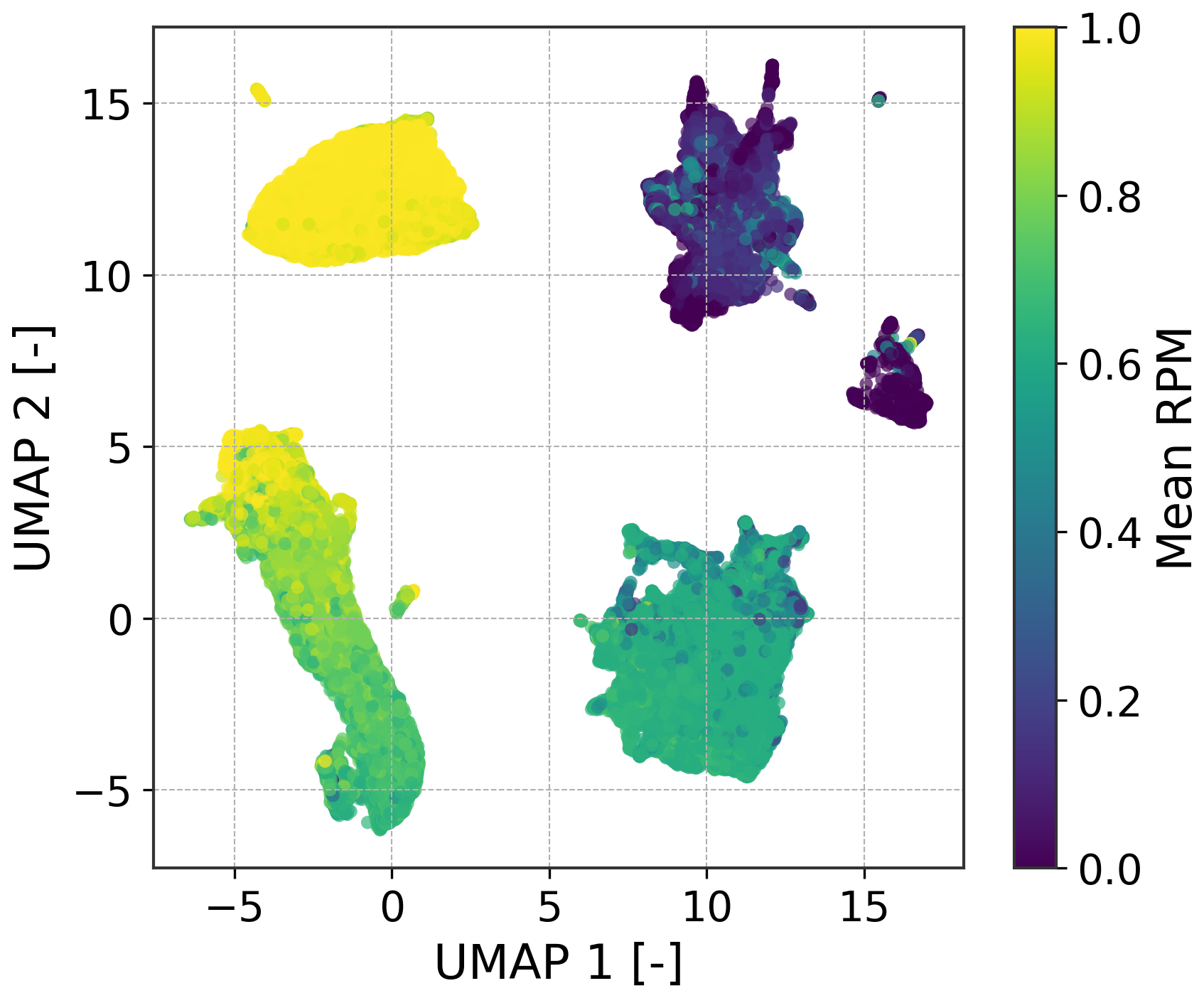 Figure 8UMAP projection colored by normalized mean RPM. The smooth gradient indicates that rotor speed is preserved in the embedding.