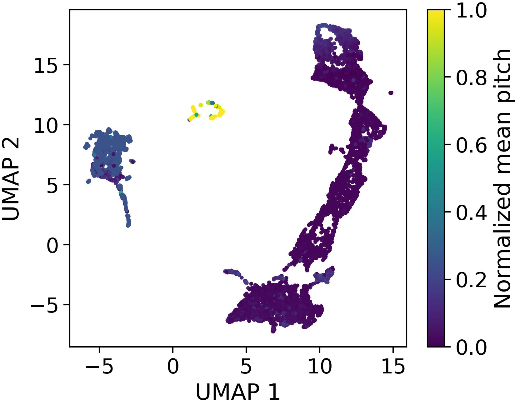 Figure 9UMAP projection of the latent embeddings learned without deep embedded clustering (DEC), colored by normalized mean blade pitch. The representation separates parked and standstill conditions from operating states, but the operating regime remains a largely continuous manifold without clear sub-structure. This illustrates that, in the absence of an explicit clustering objective, the latent space is not naturally partitioned into distinct operational regimes, motivating the use of DEC to enforce clusterable and interpretable embeddings.