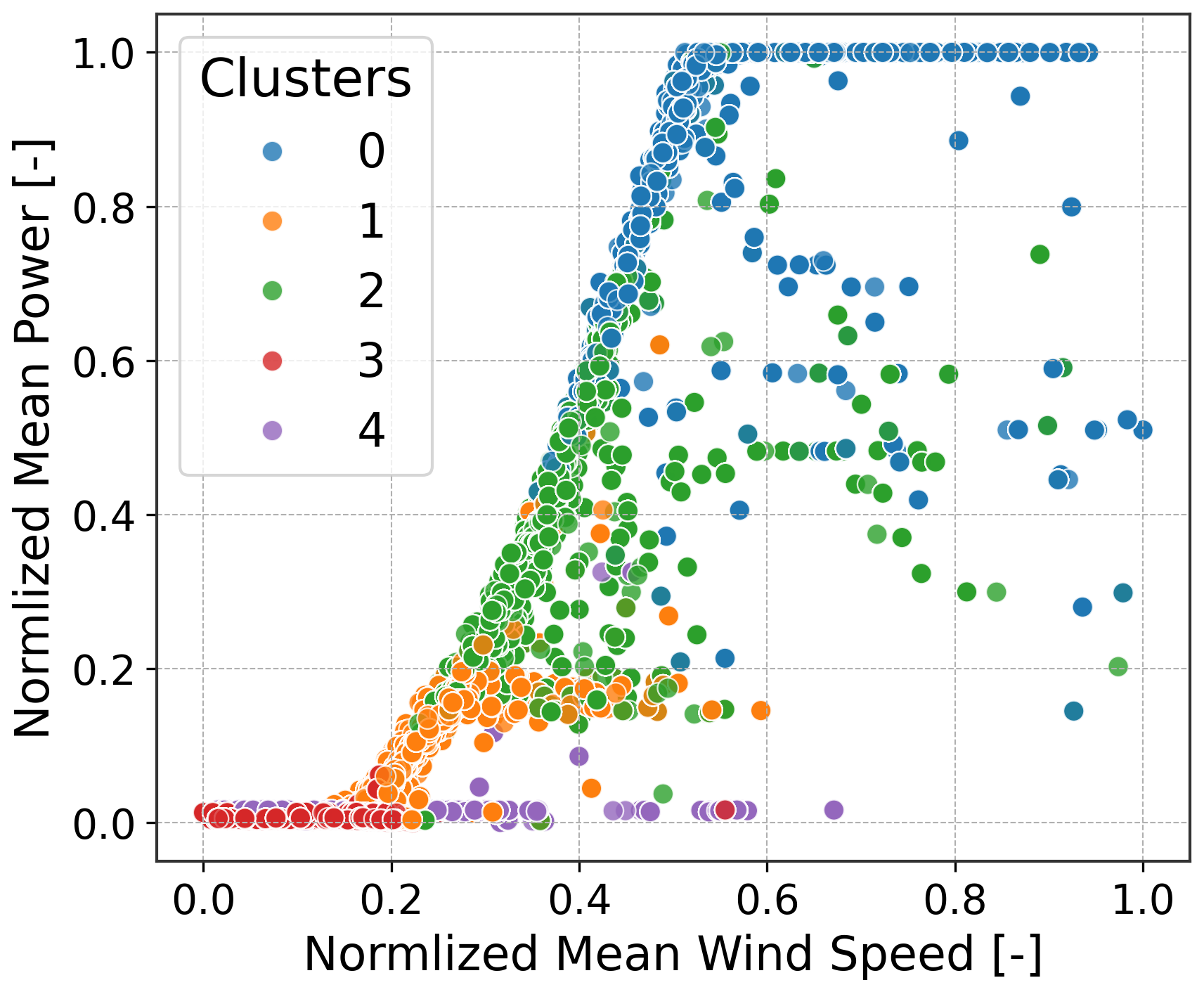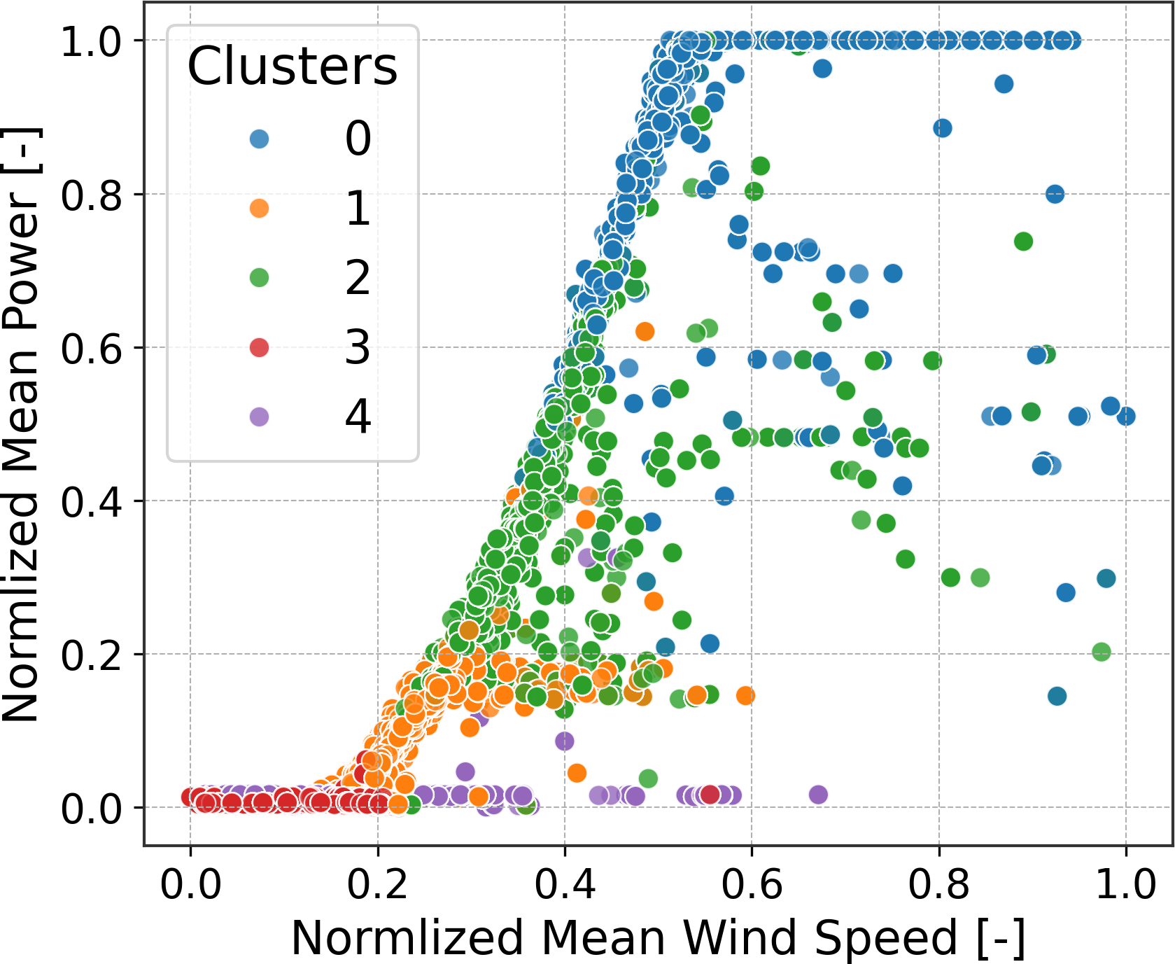 Figure 10Normalized power versus wind speed, colored by latent-space clusters. Regimes align with canonical power curve regions.