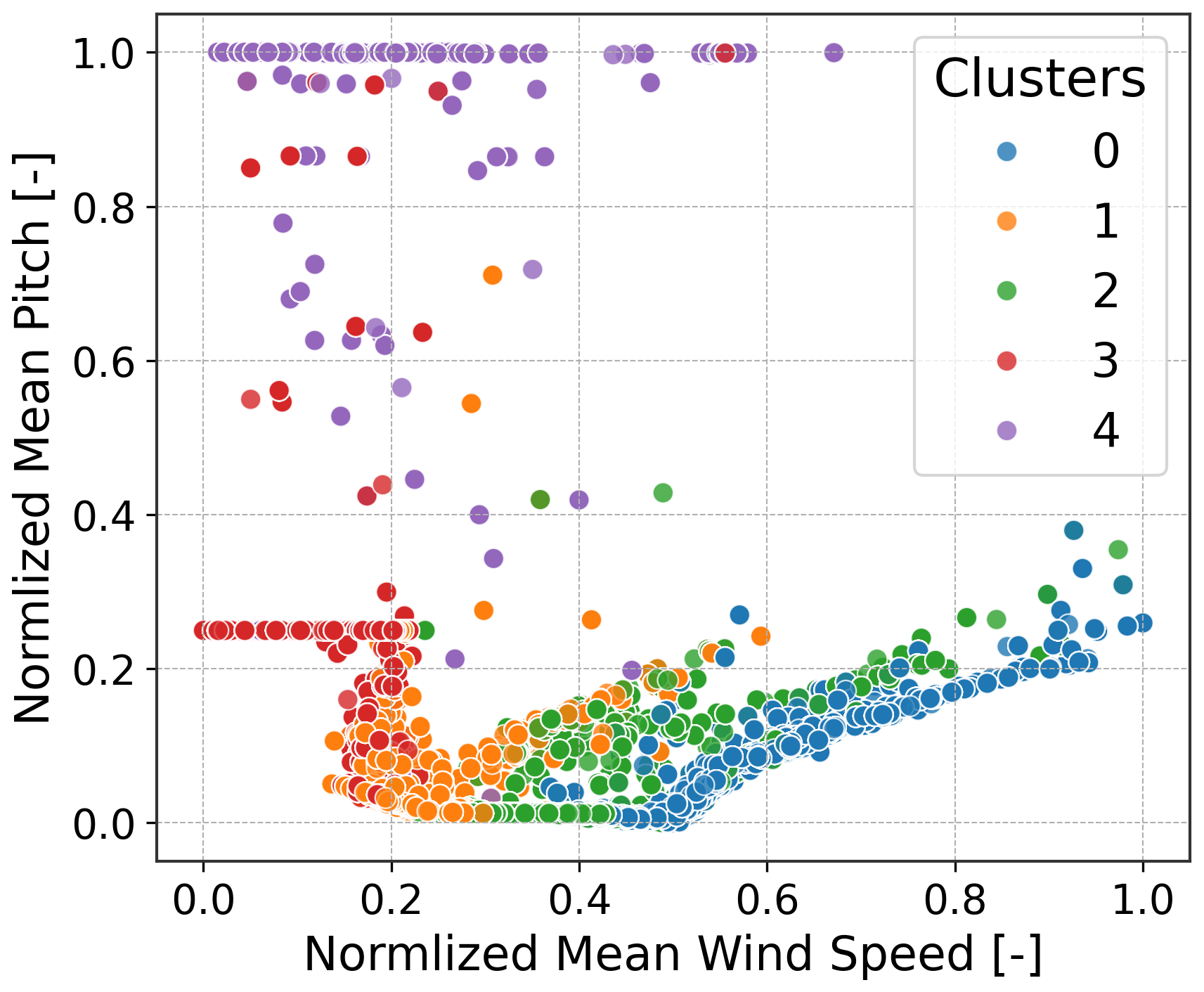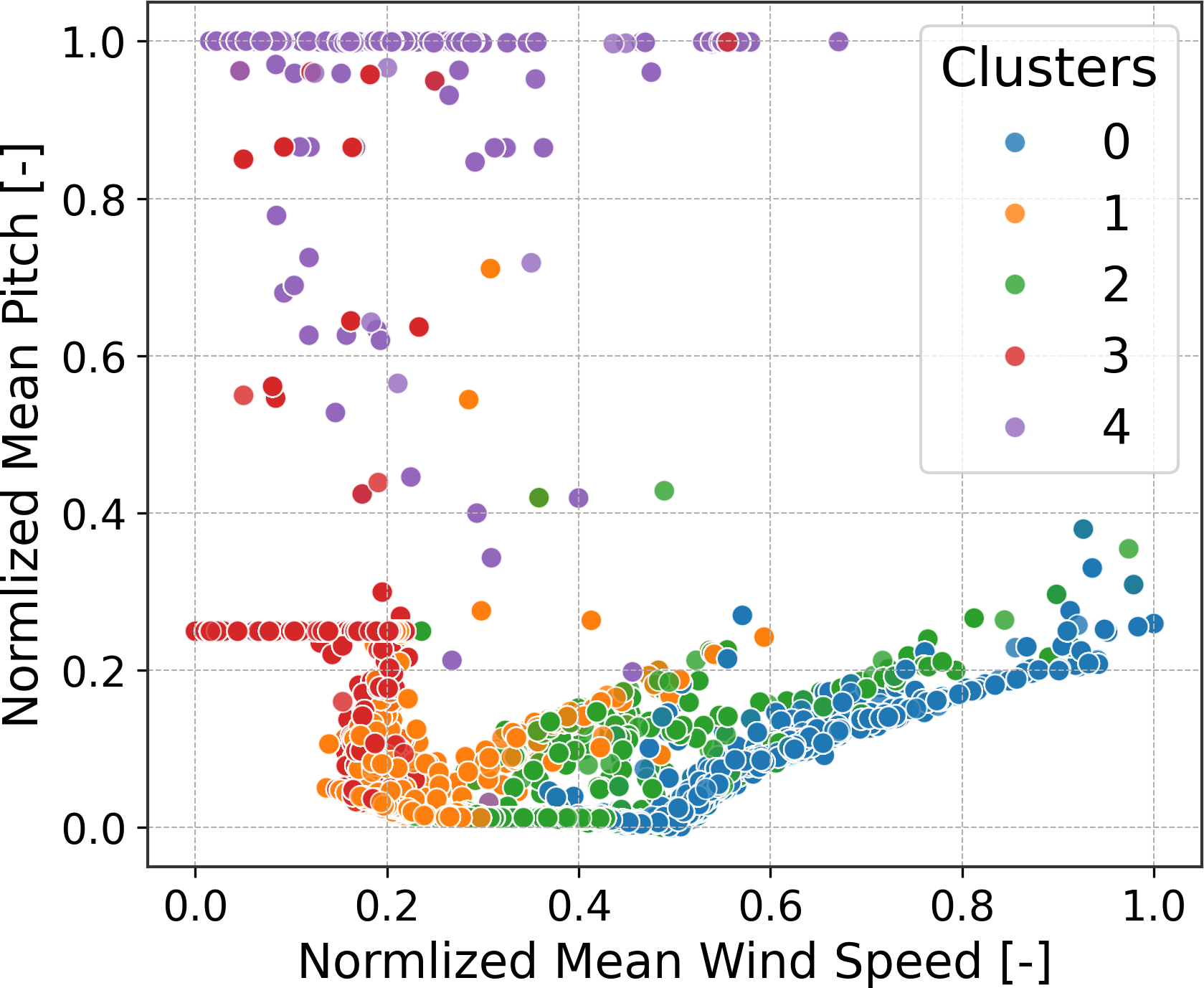 Figure 11Normalized pitch versus wind speed, colored by clusters. High-pitch curtailed or stopped regimes separate from low-pitch operating regimes.