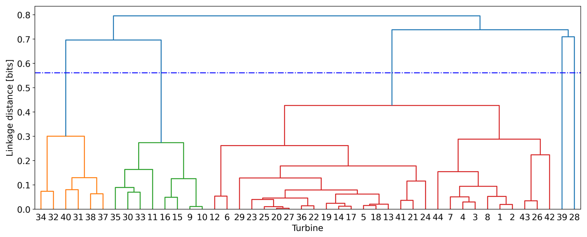 Figure A1Dendrogram from pairwise mutual-information dissimilarity D between turbines based on acceleration-derived embeddings (no DANN). Each merge height reflects the dissimilarity in bits; higher values indicate more distinct turbine dynamics. The five clusters obtained correspond to groups of turbines with similar vibration behavior as represented by the auto-encoder.