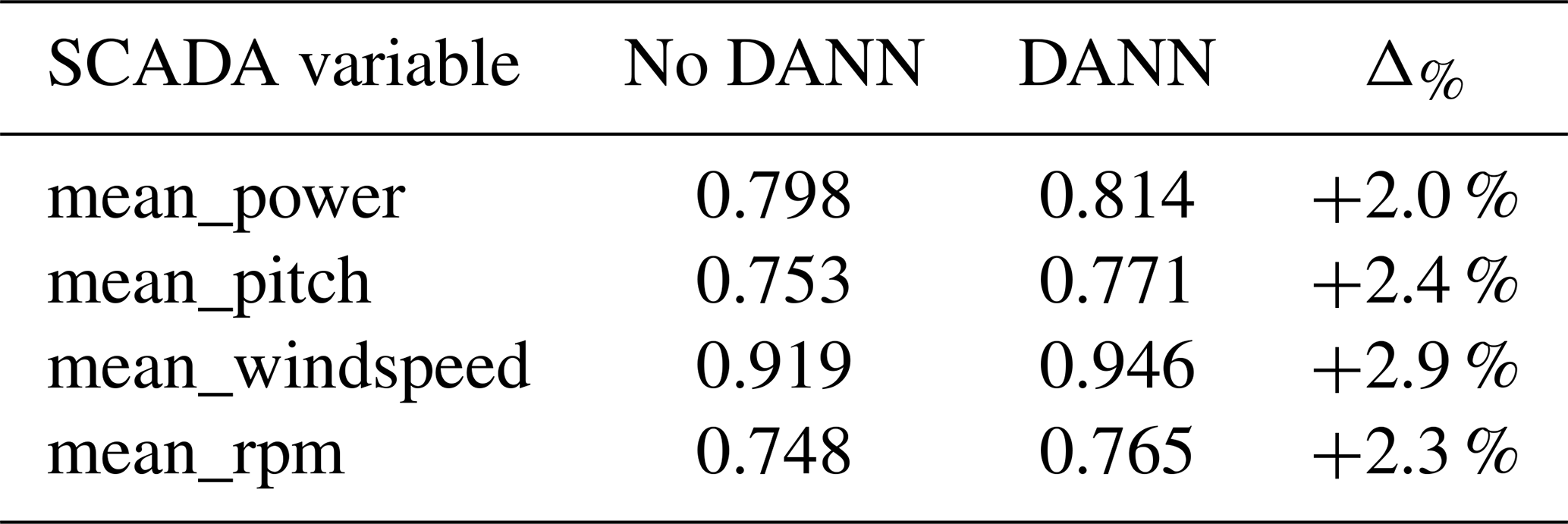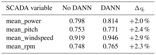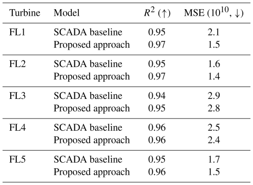 Importantly, the comparison is asymmetric by design. The baseline model is trained on a substantially longer dataset, namely a full year of data (and 2 full years in the internal implementation). In contrast, the proposed approach is trained on only 1000 h per turbine and does not use SCADA information at any stage, although it takes full leverage of the higher sampling rate. The baseline, as such, constitutes a best-case reference rather than an information parity comparator.