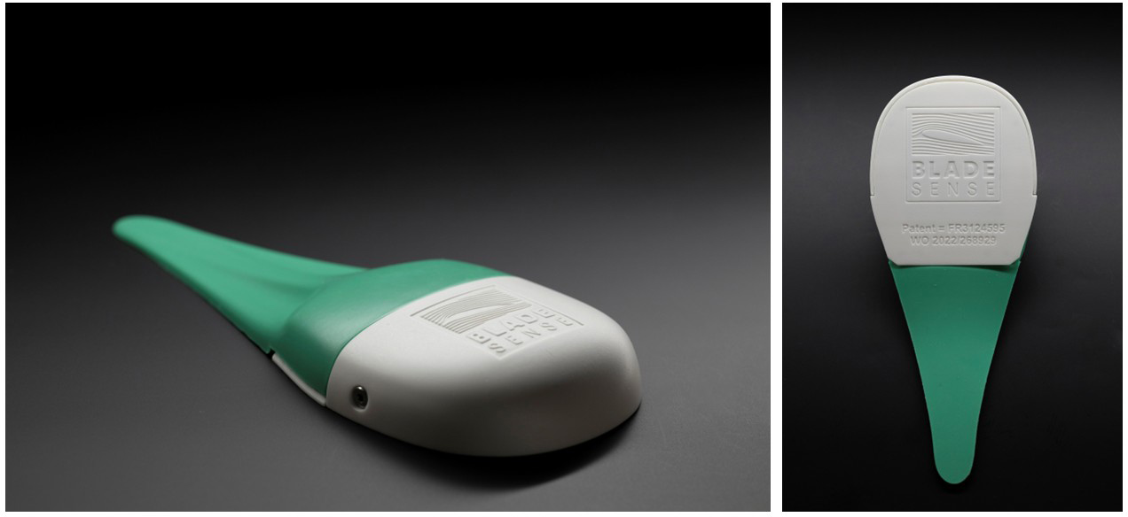 eTellTale's sensor is a wireless aerodynamic stall sensor based on hall effect (Fig. 1), each composed of a silicone strip. It is glued on the blade's suction side to qualify the inflow behaviour on the blade (detached or attached) in real time at 200 Hz, with a filtering standard deviation of magnetic field Bz (10−3 Tesla).