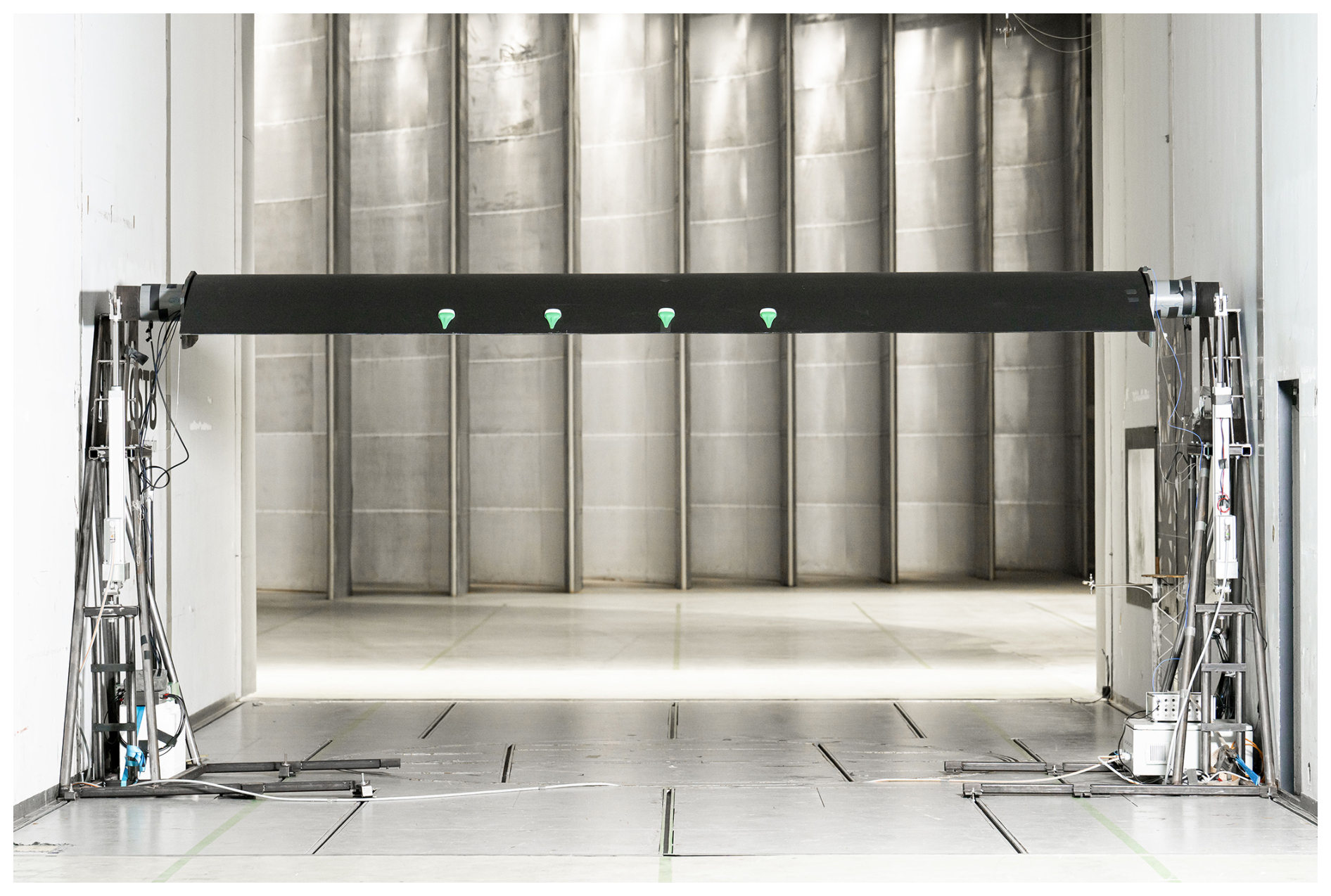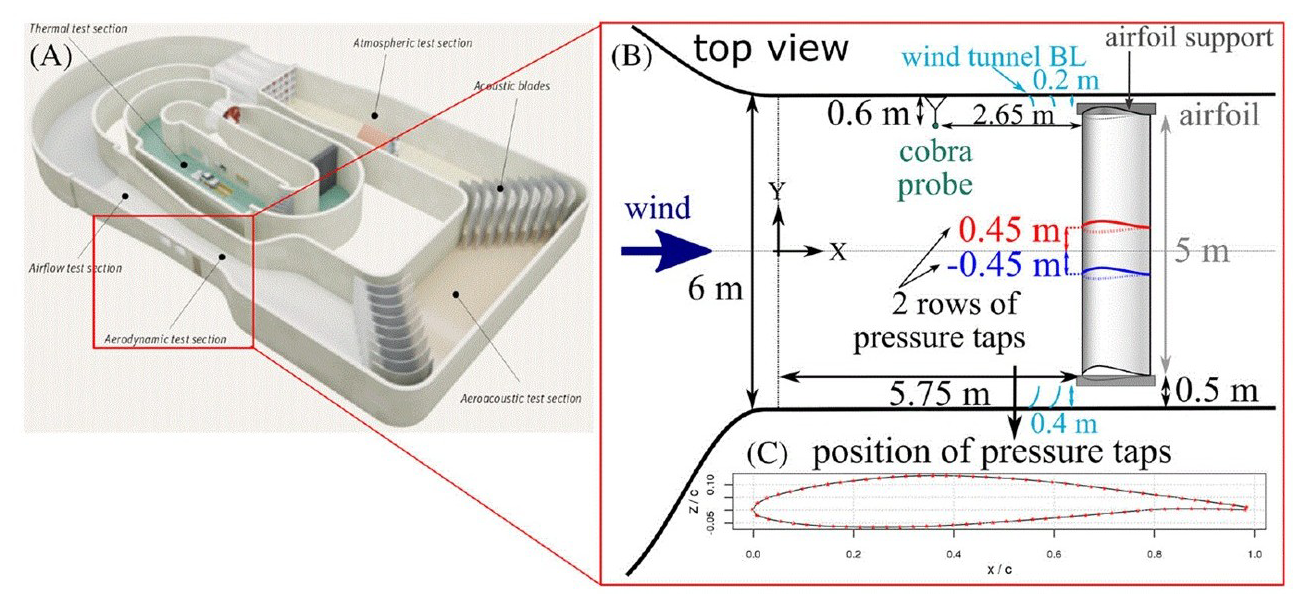 The experiments were conducted in the 5 m × 6 m high-speed wind tunnel at CSTB Nantes (see Fig. 2 and Neunaber et al., 2022, for further details). Its turbulent intensity level is less than 3 %. The airfoil profile has been scanned on a real wind turbine blade (Senvion 2 MW) at 80 % from the blade root.