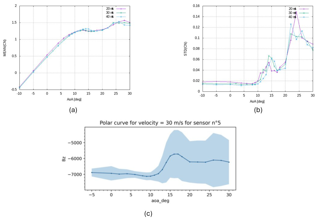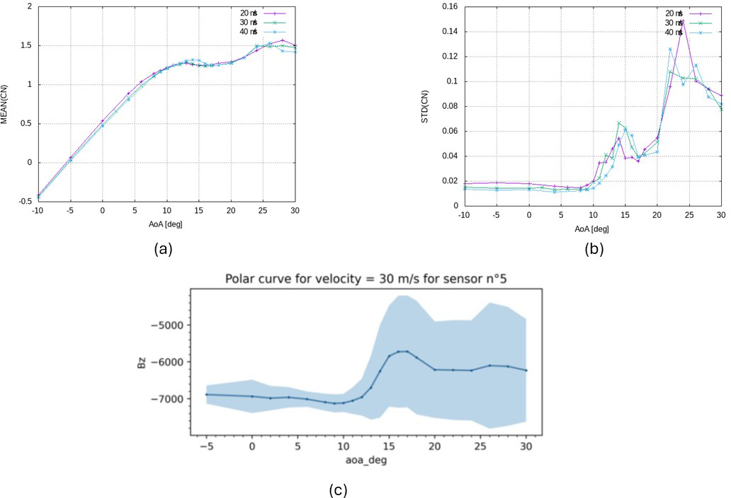 Figure 4a, b show mean and standard deviation (STD) lift versus AoA, while Fig. 4c shows the eTT signal with its standard deviation in the filled area.