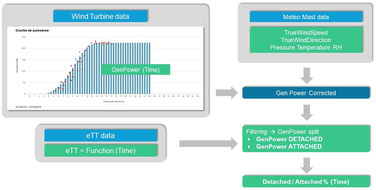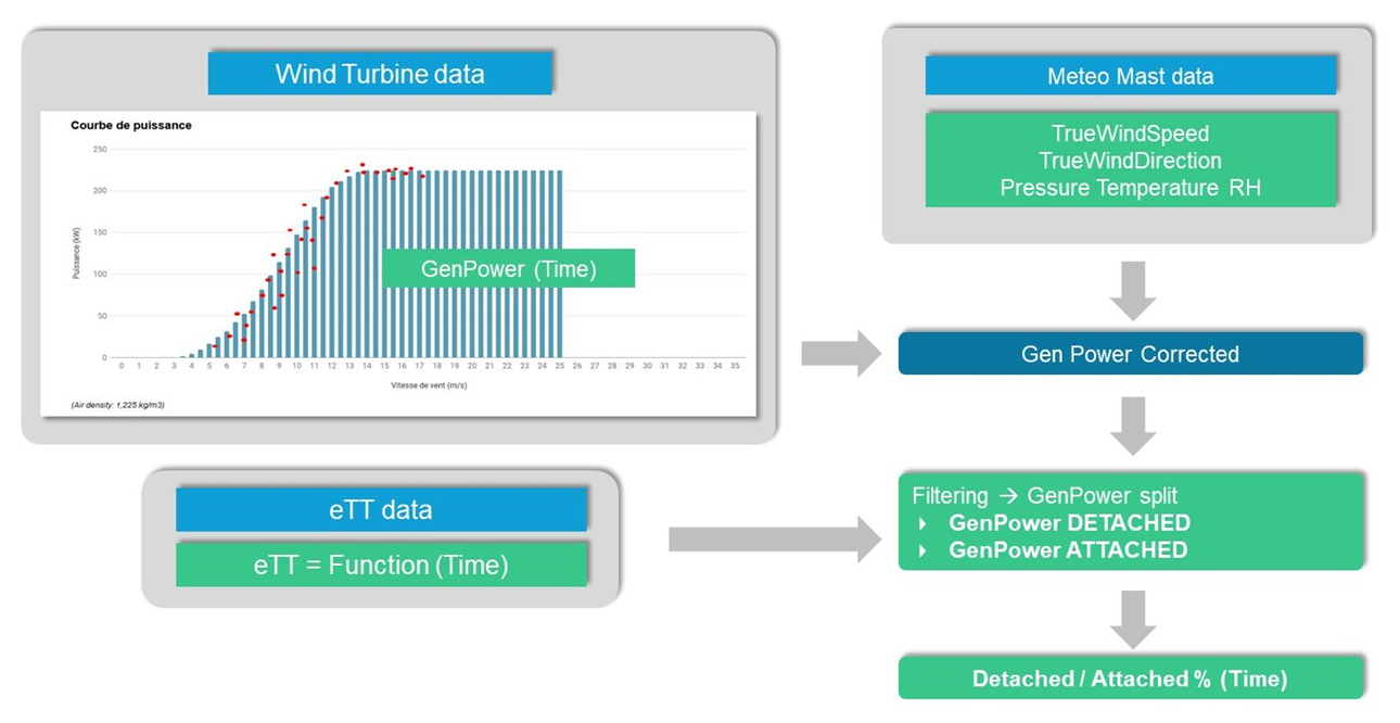 The approach was made possible by applied mathematical tools linking the eTT signals on a two-dimensional model full-scale blade in the CSTB high-speed wind tunnel to lift coefficient and angle of attack (AoA). The research quantifies the effect of aerodynamic behaviour on the wind turbine electric power production. The power loss criteria is considered to prove that eTT raw data are highly correlated with the output power of the wind turbine.