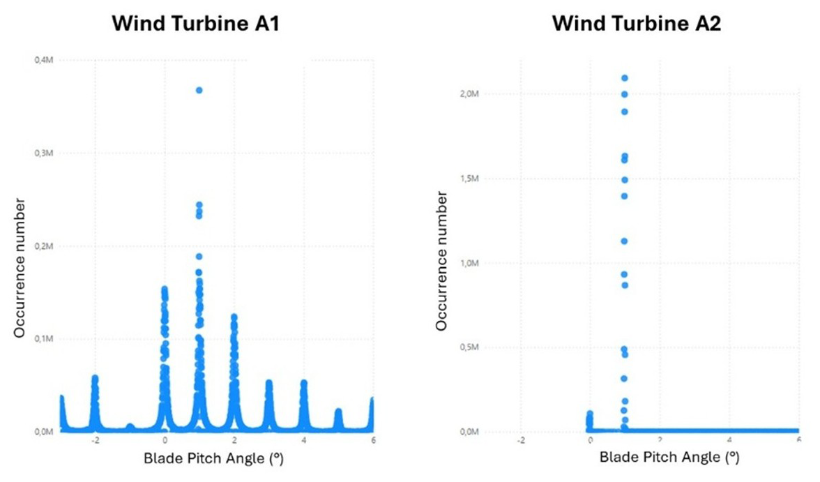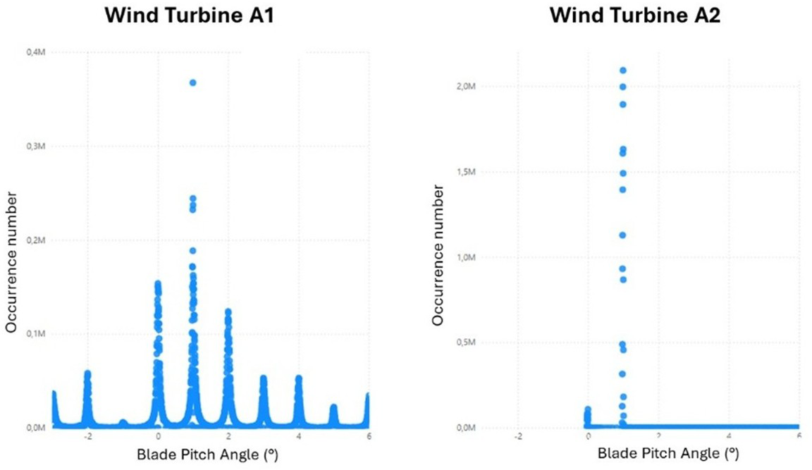 If we look at the regulation of the pitch angle (Figs. 18 and 19), we can see that the amplitude of regulation between A1 and A2 is very different. For A1, the angle goes from 0.5 to 1.5°, while A2 goes from 0.97 to 1.03°. This is also confirmed by the distribution of pitch angles during the test.