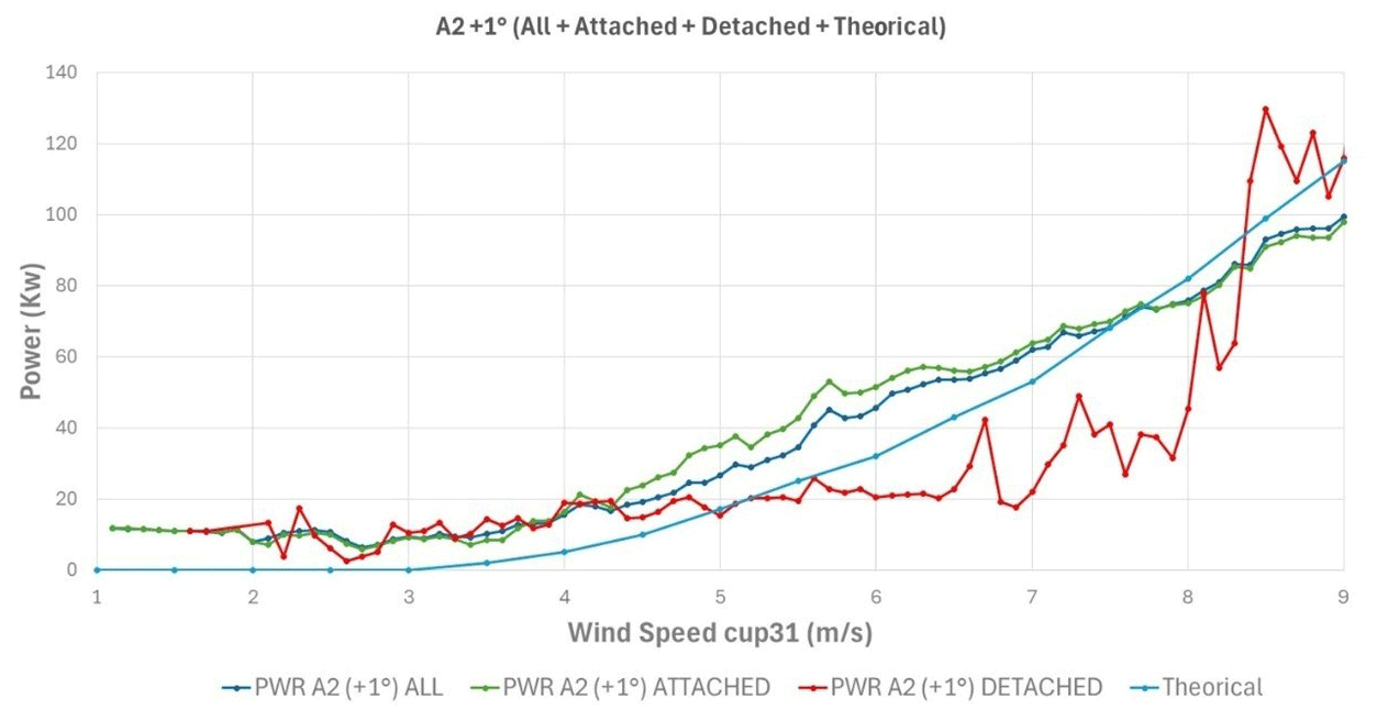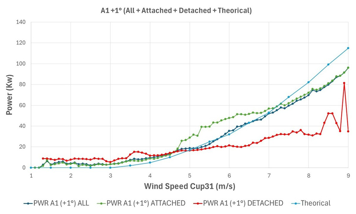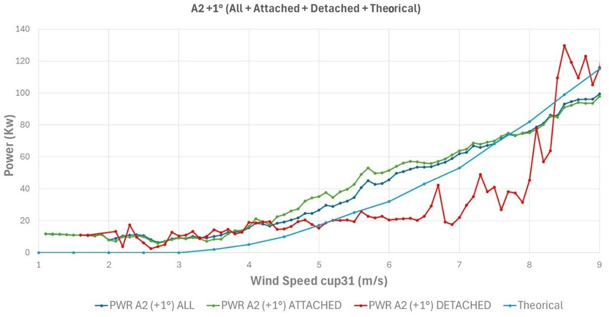 A pitch control strategy searching for attached R9 just before hard stall behaviour will produce the maximum power as seen in the range 4.7–7.5 m s−1 for A1, 4.7–6.5 m s−1 and for A2, and confirmed by the convergence of A1 to A2 performance in this range.