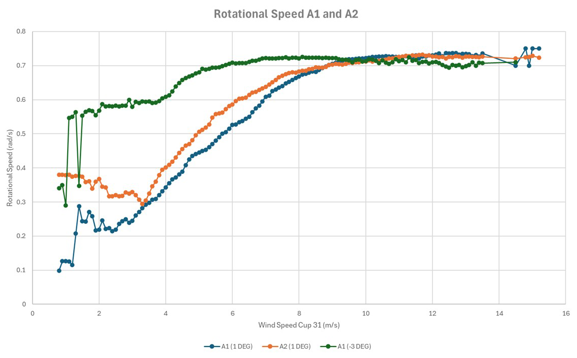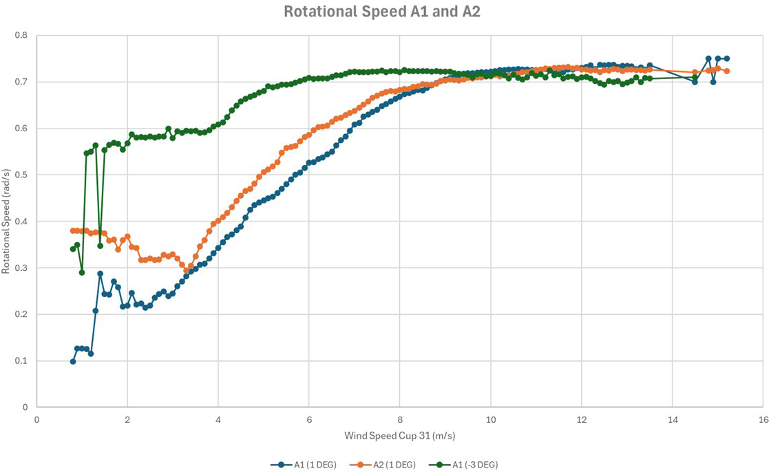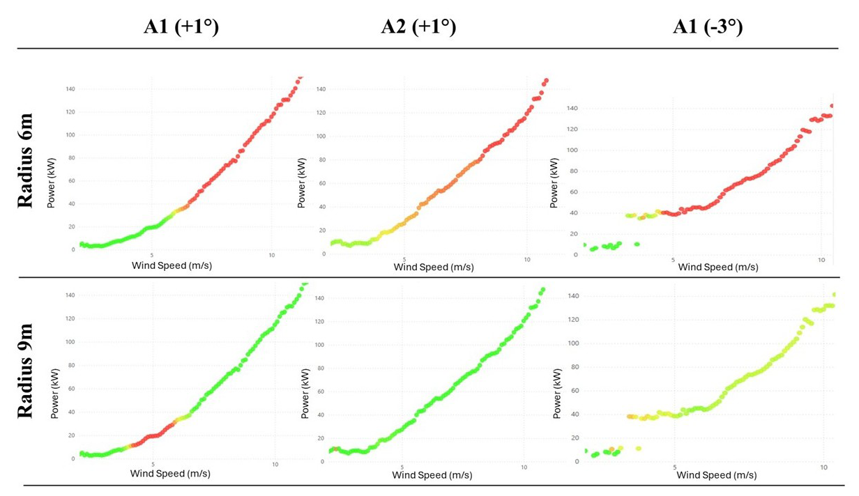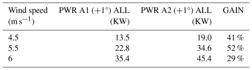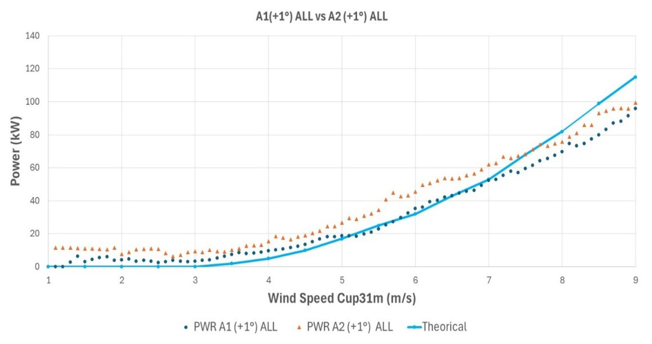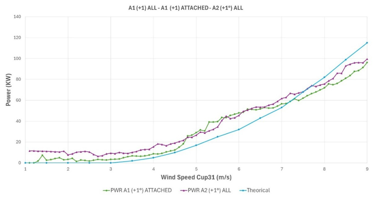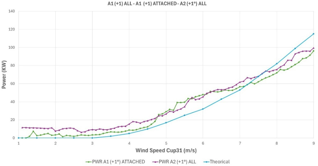 • The test at −3° of pitch for A1 confirms that it is possible to obtain more with the same wind turbine when the AoA increases to the optimal angle.