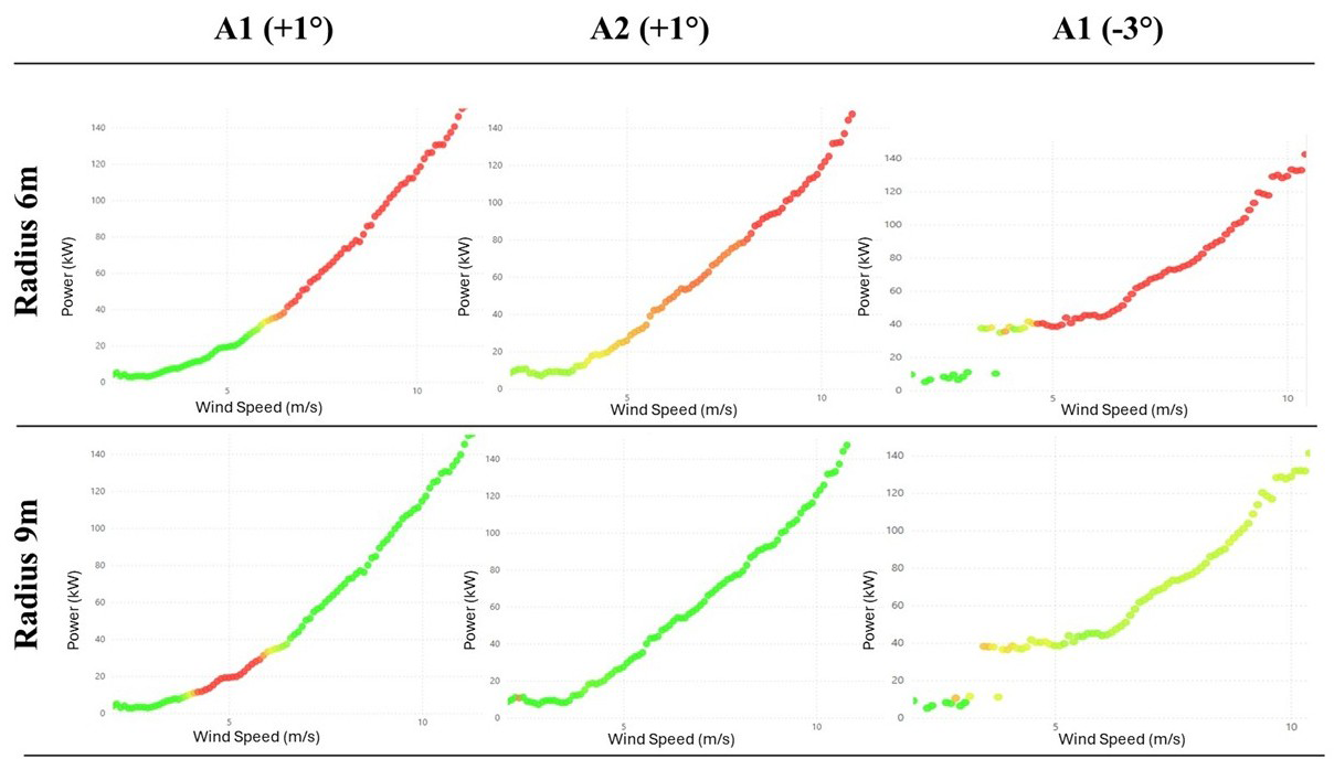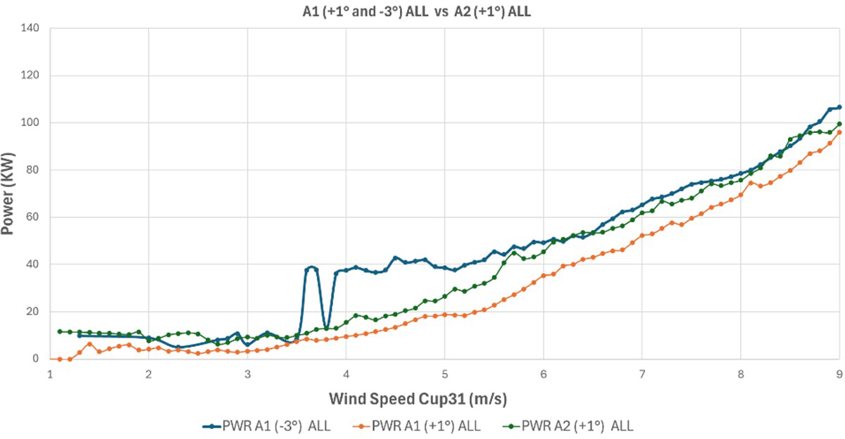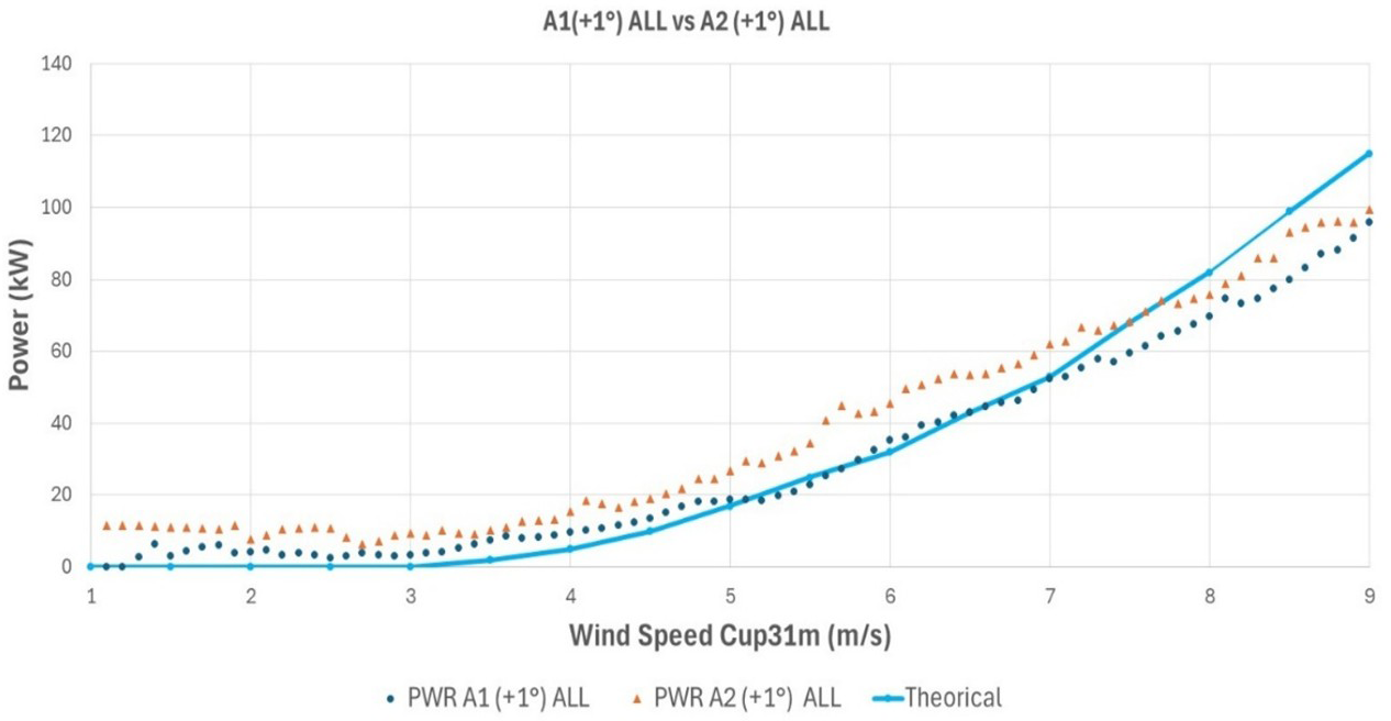 The power curve is plotted in Figs. 10, 11, 12 and 13 for the A1 and A2 wind turbines at +1° of pitch angle (reference value for optimum TSR). The power curve is plotted in Fig. 14 for A1 at −3°, A1 at +1° and A2 at +1°.