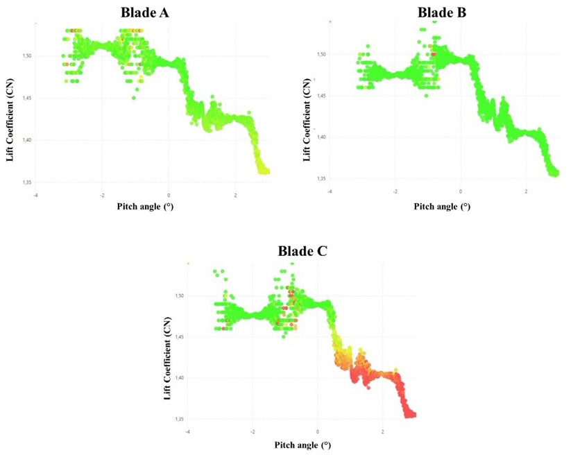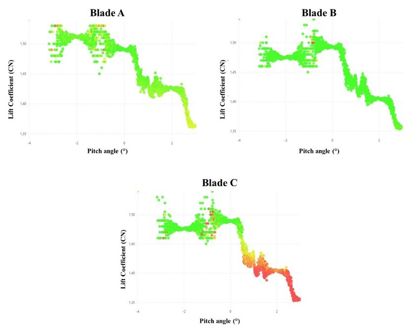 The normal (to the chord) lift coefficient CN is estimated with eTT raw data, rotor speed and wind speed by applied mathematical model and trained with data from the wind tunnel. Figure 20 represents a CN function of the pitch angle for each blade. Colours represent the standard deviation of eTT raw data (green = attached; red = detached).
