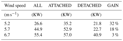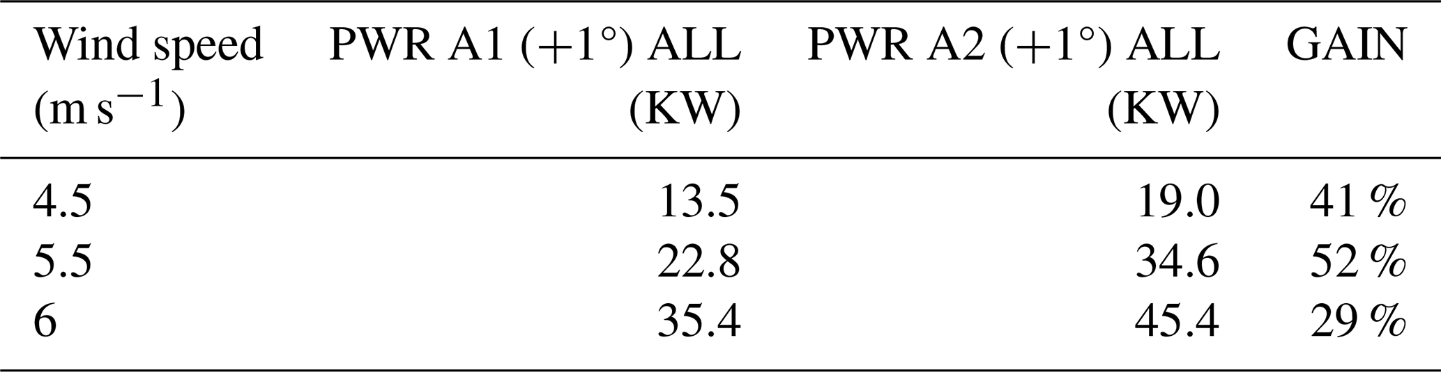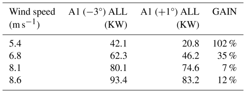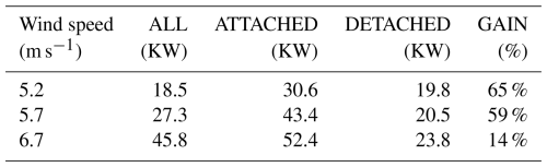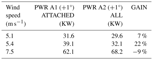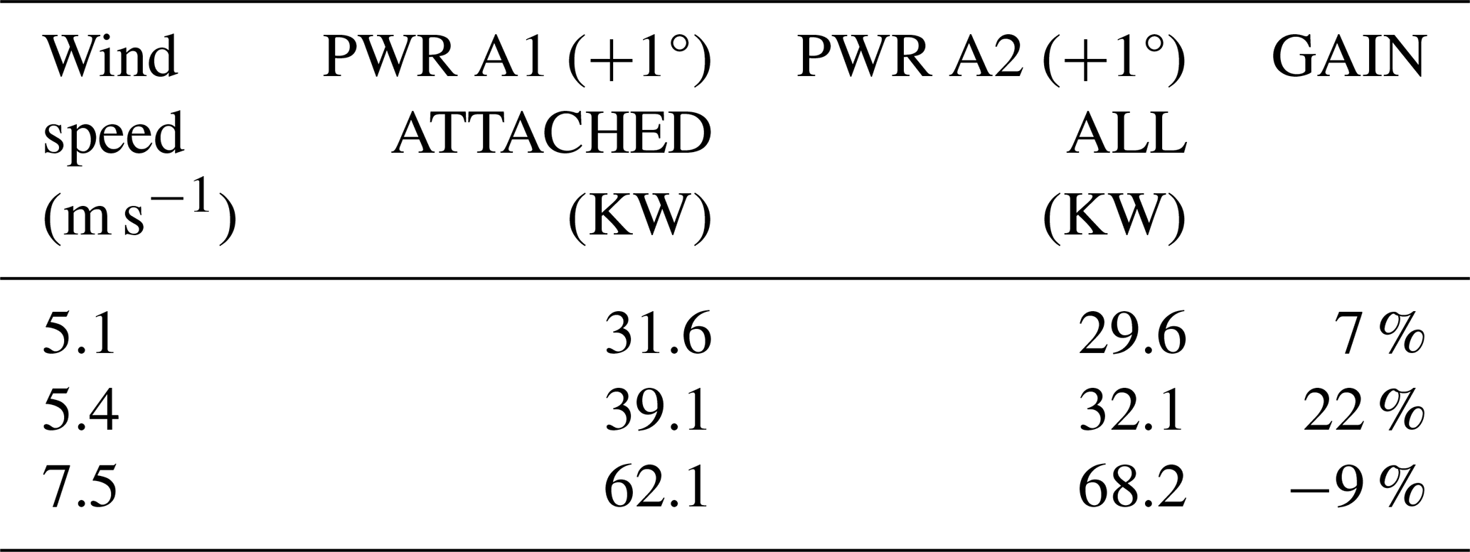 • For instance, for A1 at 5.2 m s−1, it is observed that when the flow is attached on eTT R9, the power is 65 % higher than for the measured power curve. There is huge potential (around 59 %) for increased power for A1 at +1° of pitch if the flow is attached at R9.