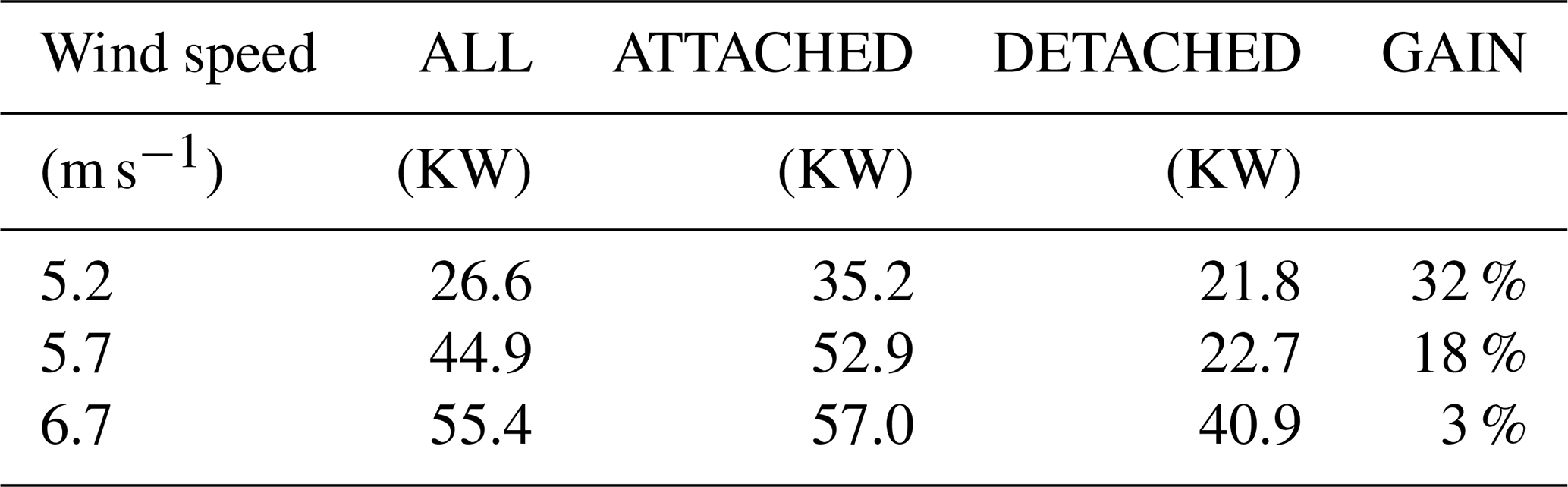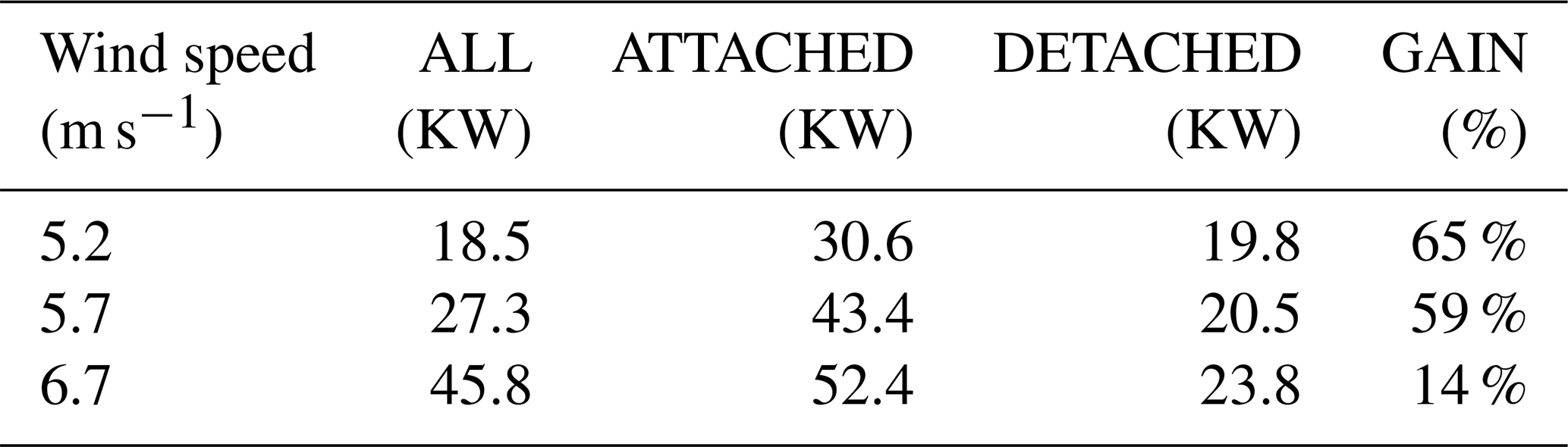 • A1R9 predominantly is detached between 4 and 6.5 m s−1, while A2R9 is attached in all the wind speed ranges,