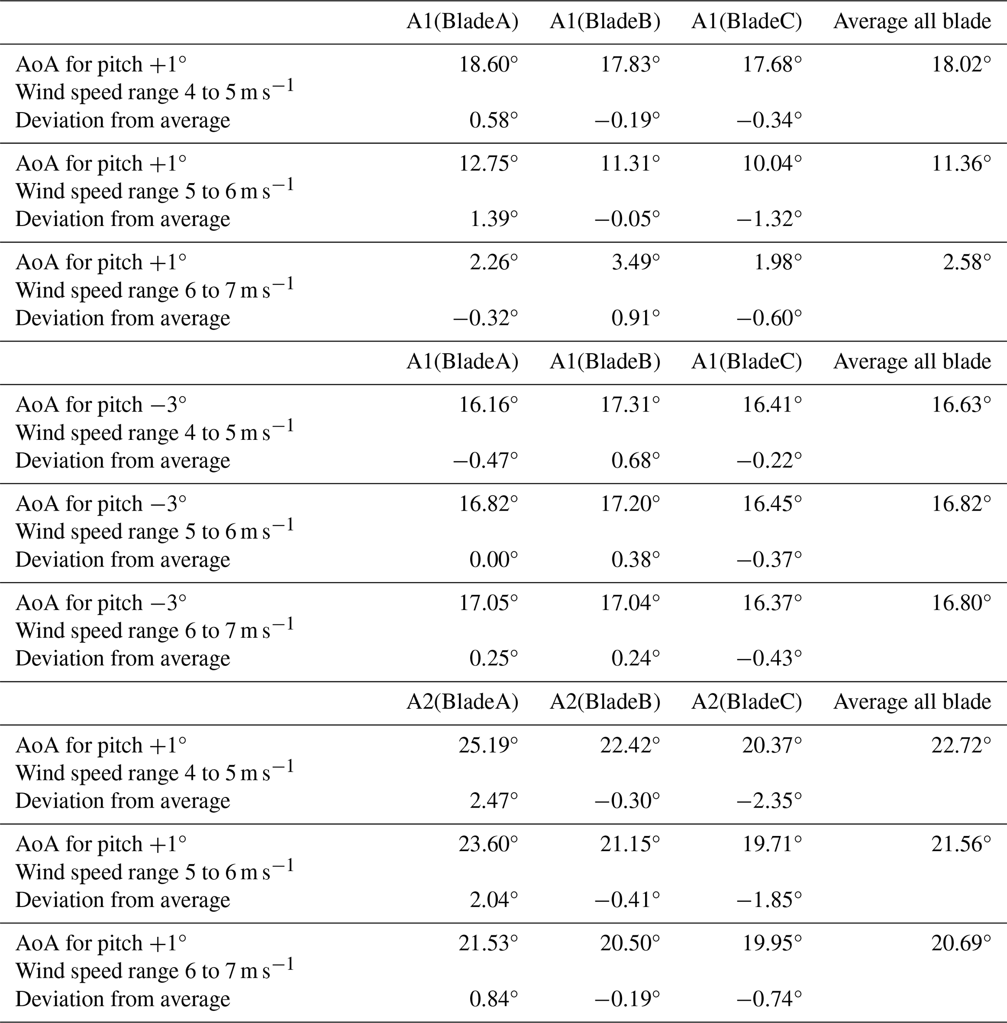 By measuring an AoA on blades at radius 6 m for a range of wind speed, it is possible to propose a pitch offset recommendation function of wind speed to get the same AoA on the three blades (Table 7). The goal is to reduce aerodynamic unbalance at all wind speed ranges.