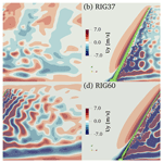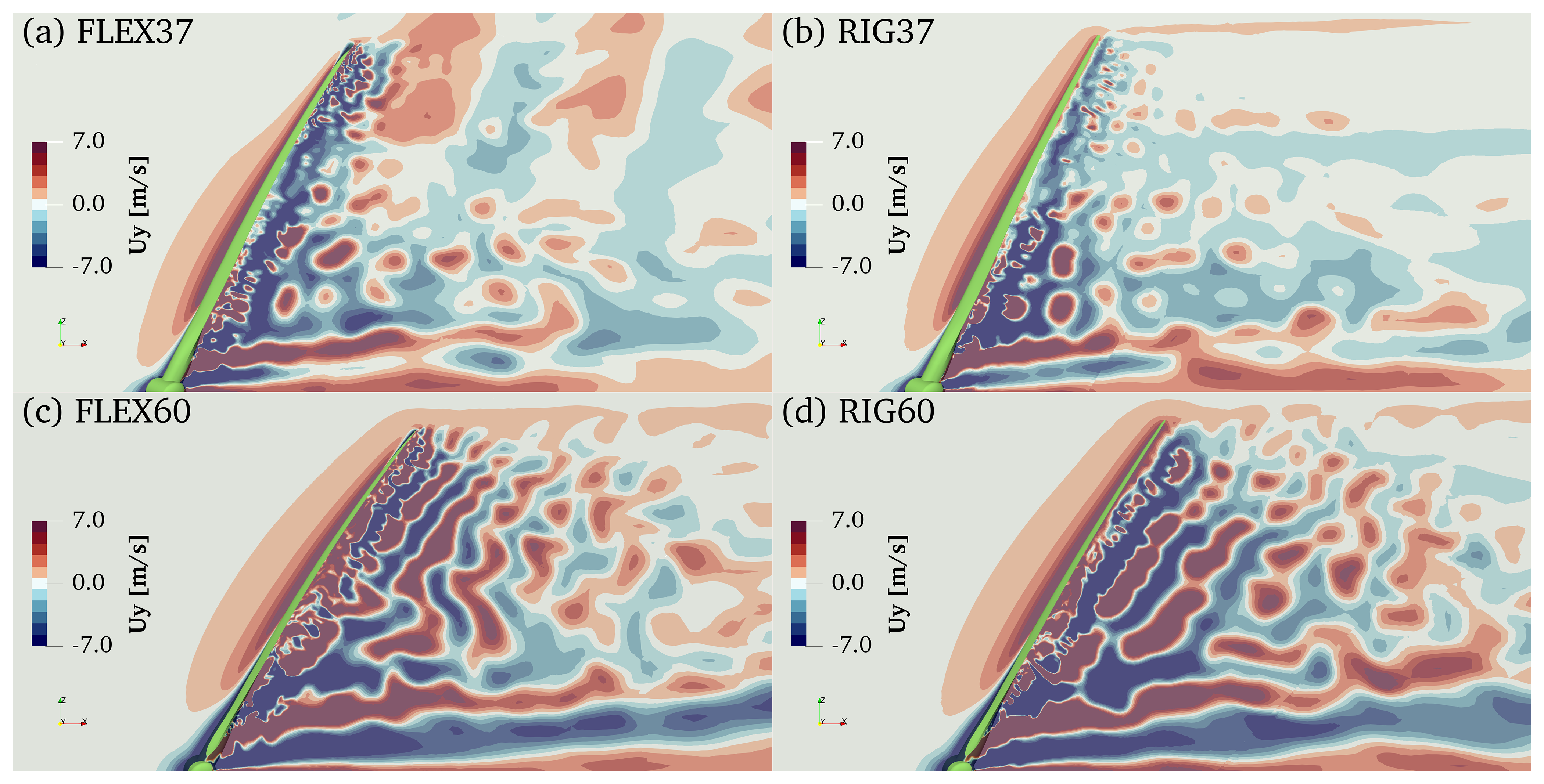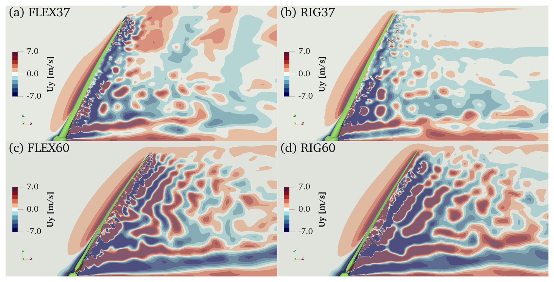 Figure 6Instantaneous side view of the normal to plane velocity component of (a) a flexible blade at −37° yaw, (b) a rigid blade at −37° yaw, (c) a flexible blade at −60° yaw, and (d) a rigid blade at −60° yaw. A positive flow component is pointing into the plane. Blade and hub are colored in green.