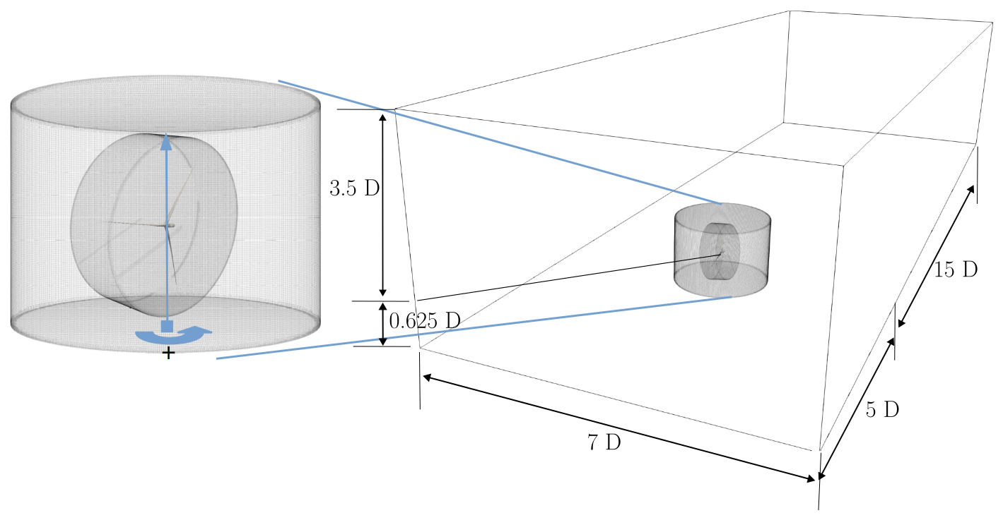 All simulations performed in this study make use of the identical overall CFD domain dimensions. As visualized in Fig. 1, the inlet distance towards the center of the imaginary rotor plane measures 1200 m, which corresponds to five rotor diameters. The distance towards the sides and the top of the domain measures 3.5 D. The rotor center itself is located 0.625 D above the ground, which corresponds to the hub height of the IEA 15 MW turbine. A tower is not included in the setup. The hub height ensures that a reasonable shear profile can be injected into the simulation. The outlet of the domain is located 15 D downstream of the rotor plane to properly resolve the wake generated by the blades.