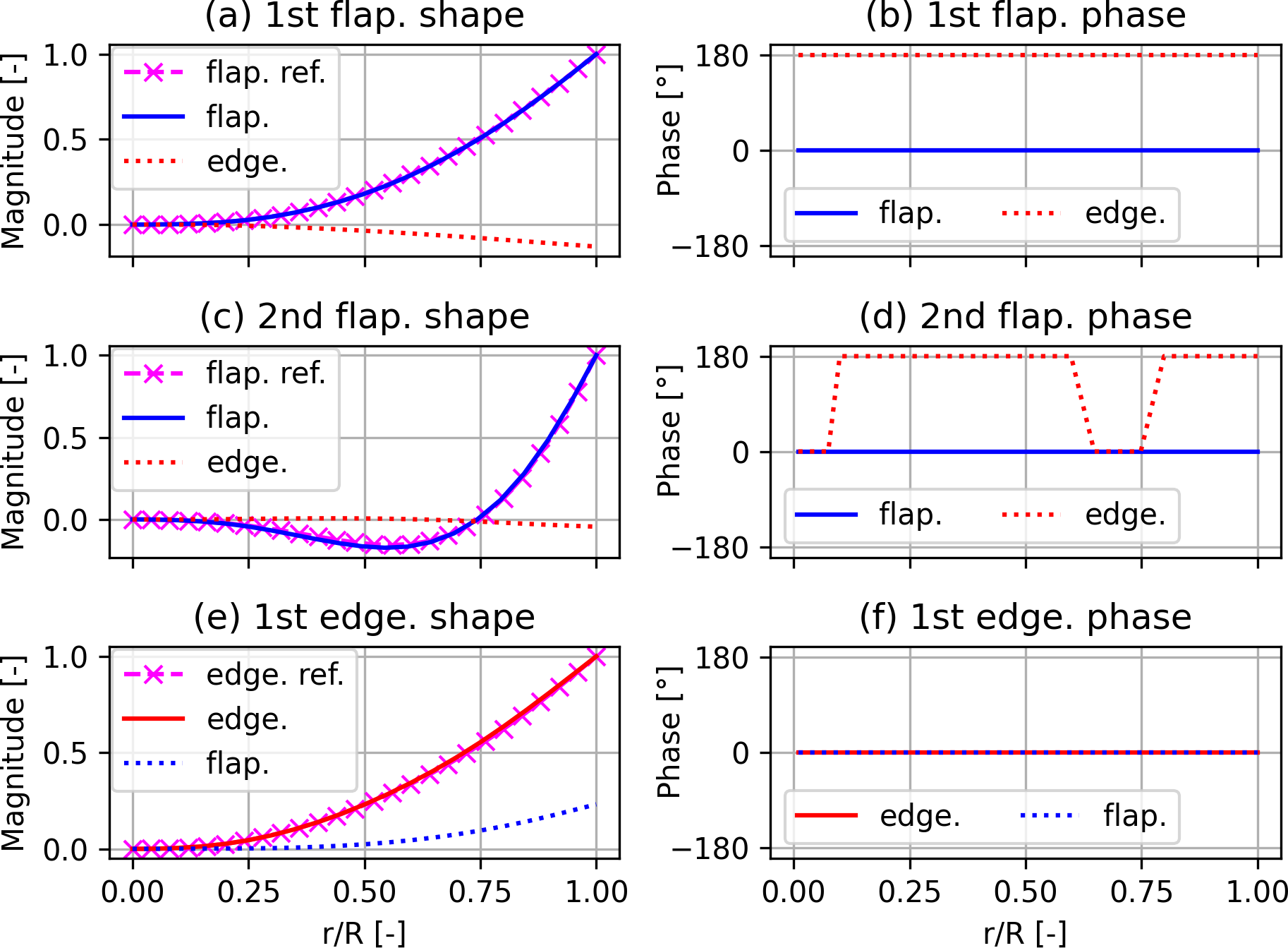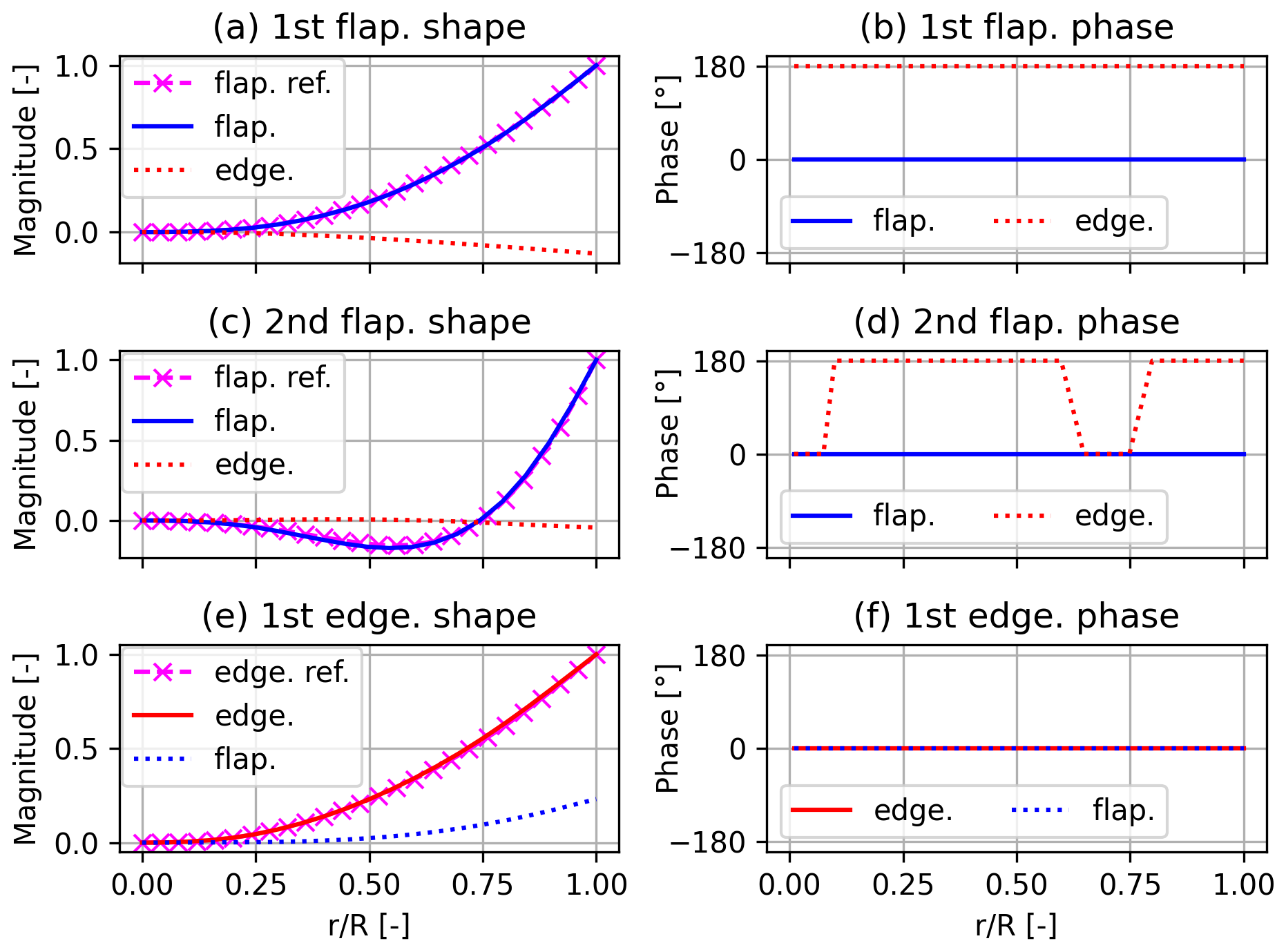 Figure 2First three modes of the IEA 15 MW blade in shape (a, c, e) and phase (b, d, f). Edgewise components are labeled as “edge.”, and flapwise components are labeled as “flap.”. Reference values are taken from IEA Wind Task 37 (2020a) and are supplemented with the designation “ref.”.