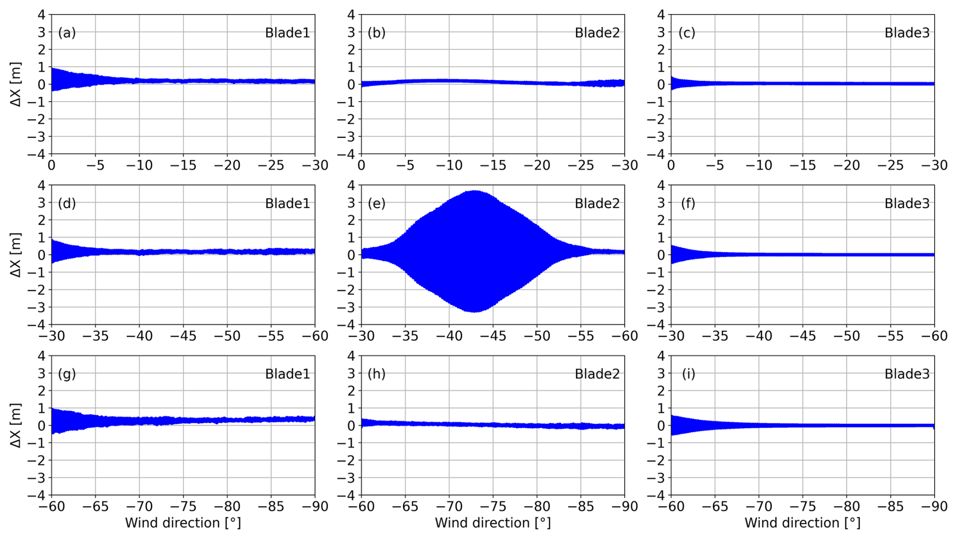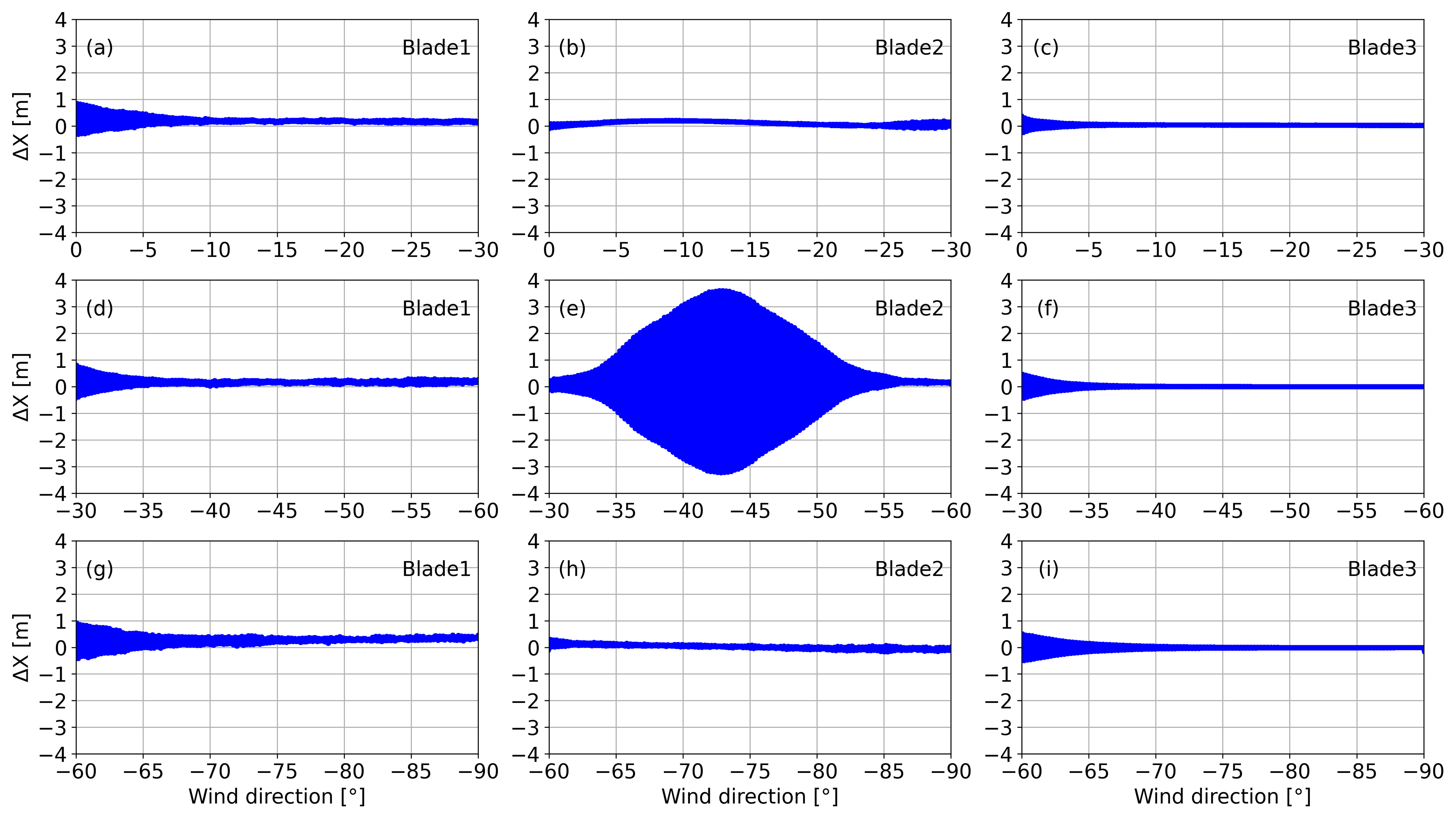 Figure 3Edgewise blade tip displacement of all three blades during a yaw maneuver. Panels (a) to (i) show the tip displacement for all three blades separately and for wind direction intervals of 30°.