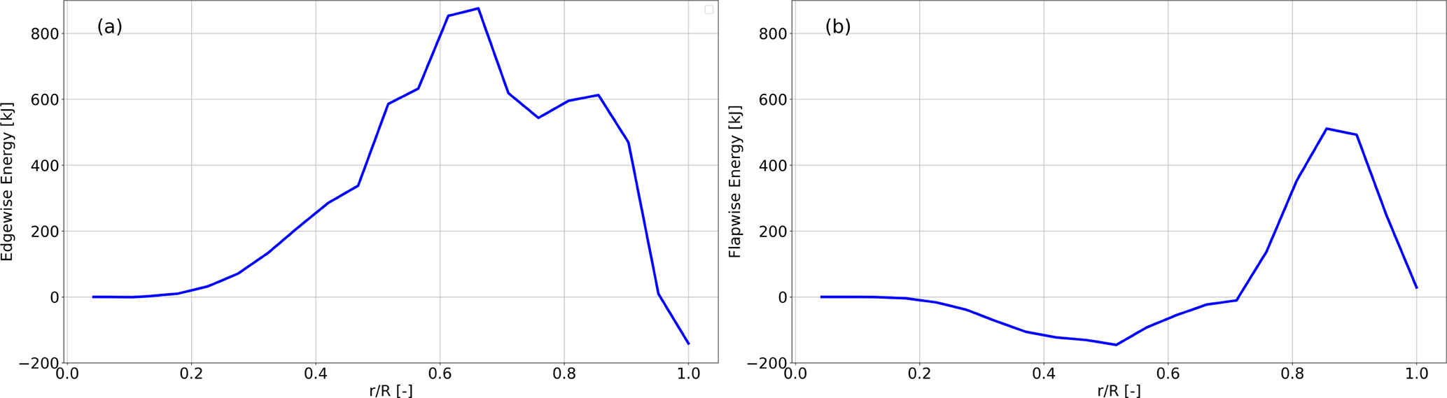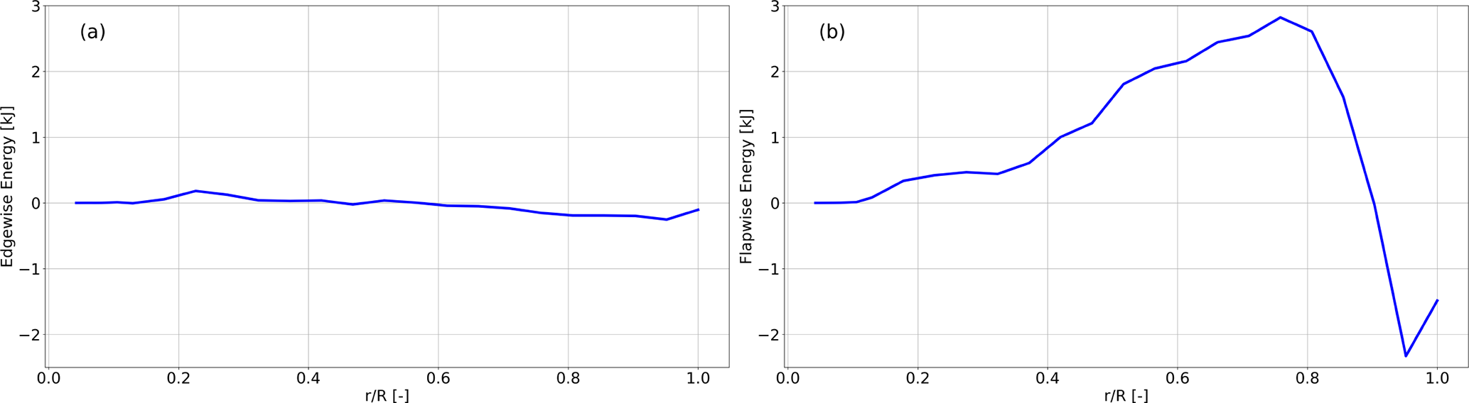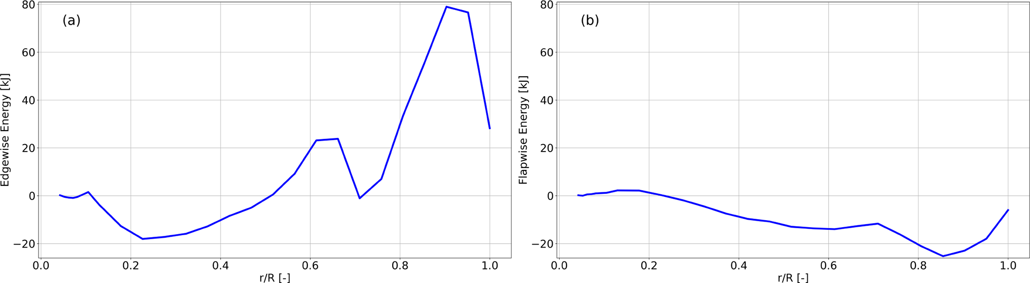 In Fig. 4 the summed edgewise (panel a) and flapwise (panel b) energy for each monitored spanwise position is shown. A positive energy value corresponds to energy being injected into the blade structure, and a negative energy value corresponds to energy being absorbed by the fluid (i.e., aerodynamic damping). For the edgewise component in Fig. 4a, a relatively weak damping for the inner half of the blade is visible, where the minimal negative value corresponds to −19 kJ. The majority of the exchanged edgewise energy is found for the outer half of the blade, with a maximum value for a relative spanwise position of 0.9 at a magnitude of 80 kJ. The total net energy for the ramp-up phase results in 240.86 kJ, which means that energy from the fluid is transferred into the blade and leads towards increasing edgewise deformations. A contrary picture is shown for the flapwise component in Fig. 4b. The majority of the blade is found to be exposed to negative energy exchange, which means that the flapwise vibration direction of the blade is being damped out. The total sum of flapwise energy is found to be −200.14 kJ.