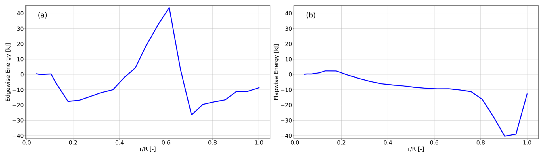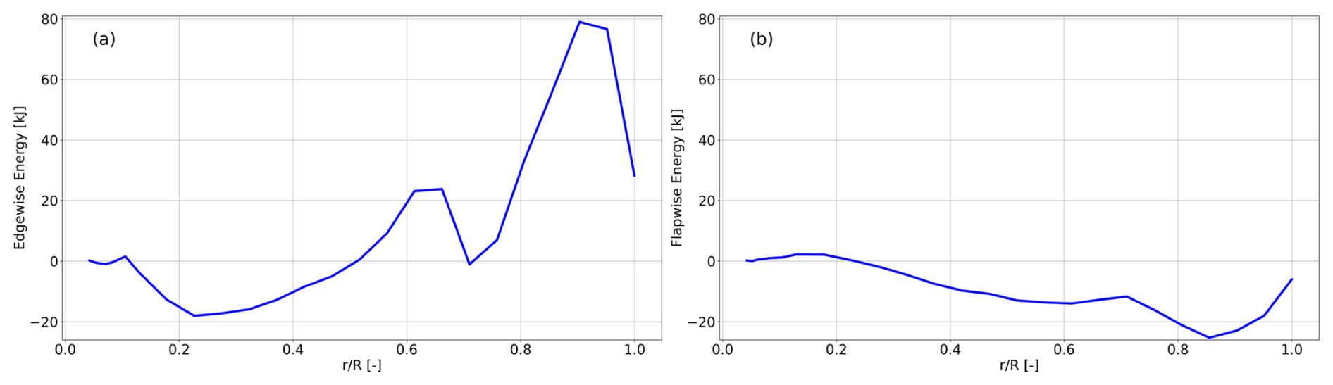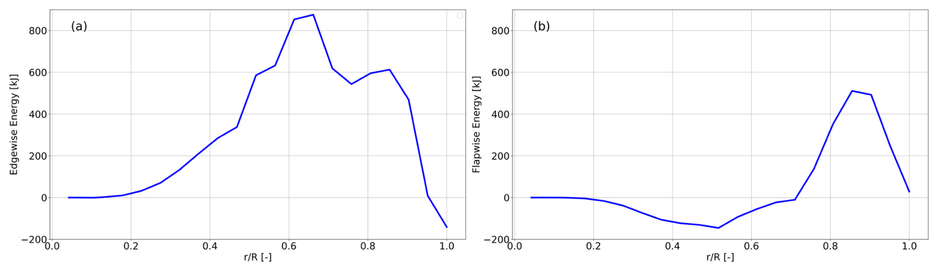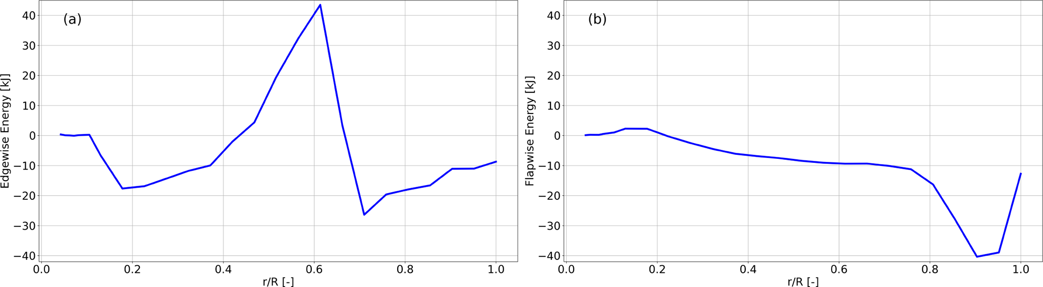 In Fig. 4 the summed edgewise (panel a) and flapwise (panel b) energy for each monitored spanwise position is shown. A positive energy value corresponds to energy being injected into the blade structure, and a negative energy value corresponds to energy being absorbed by the fluid (i.e., aerodynamic damping). For the edgewise component in Fig. 4a, a relatively weak damping for the inner half of the blade is visible, where the minimal negative value corresponds to −19 kJ. The majority of the exchanged edgewise energy is found for the outer half of the blade, with a maximum value for a relative spanwise position of 0.9 at a magnitude of 80 kJ. The total net energy for the ramp-up phase results in 240.86 kJ, which means that energy from the fluid is transferred into the blade and leads towards increasing edgewise deformations. A contrary picture is shown for the flapwise component in Fig. 4b. The majority of the blade is found to be exposed to negative energy exchange, which means that the flapwise vibration direction of the blade is being damped out. The total sum of flapwise energy is found to be −200.14 kJ.