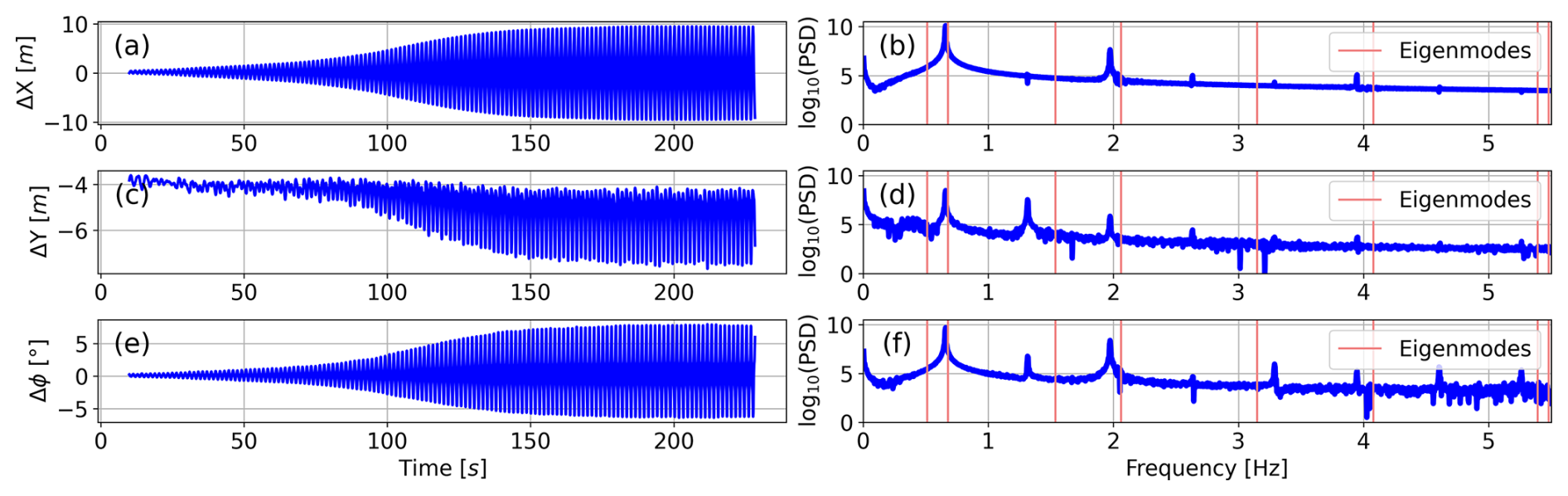 At a fixed yaw angle, the edgewise, flapwise, and torsional components of the blade tip vibration of case FLEX37 are shown in Fig. 7 in the time and frequency domain. It is visible that the edgewise amplitude (Fig. 7a) reaches much higher values compared to the dynamic yaw maneuver shown in Fig. 3e as the blade stays in the critical region until it reaches a limit cycle oscillation. Here, the limit cycle is reached at 180 s, with an amplitude of 9.5 m, where the injected aerodynamic power and structural damping are balancing each other out. This is roughly 3 times the amplitude of the yawing case. From a frequency perspective, this motion is mainly dominated by the edgewise eigenfrequencies. The flapwise and torsional natural frequencies do not appear to impact the vibration behavior. This is shown in Fig. 7b, where the vertical red lines mark the blade's natural frequencies, and the second lowest corresponds to the first edgewise eigenfrequency. At this point, a slight shift in the blade's inherent oscillation frequencies towards smaller values can be noted relative to the theoretical eigenfrequencies that are based on a preceding modal analysis. This behavior is attributed to the non-linear characteristics of the blade structure, which become evident as a result of the significant deformation amplitudes. A similar behavior was also described in Abdeljawad et al. (2020). Similar findings can be observed in both the flapwise and torsional components. The flapwise component reaches an oscillation amplitude of approximately 1.7 m at a mean deflection of −5.8 m. At the limit cycle, the torsional component oscillates between −6.1 and 7.7°. Both components appear to be largely influenced by the edgewise natural frequency (see Fig. 7d and f). Consequently, the investigations will mainly focus on the edgewise component of the blade vibrations.