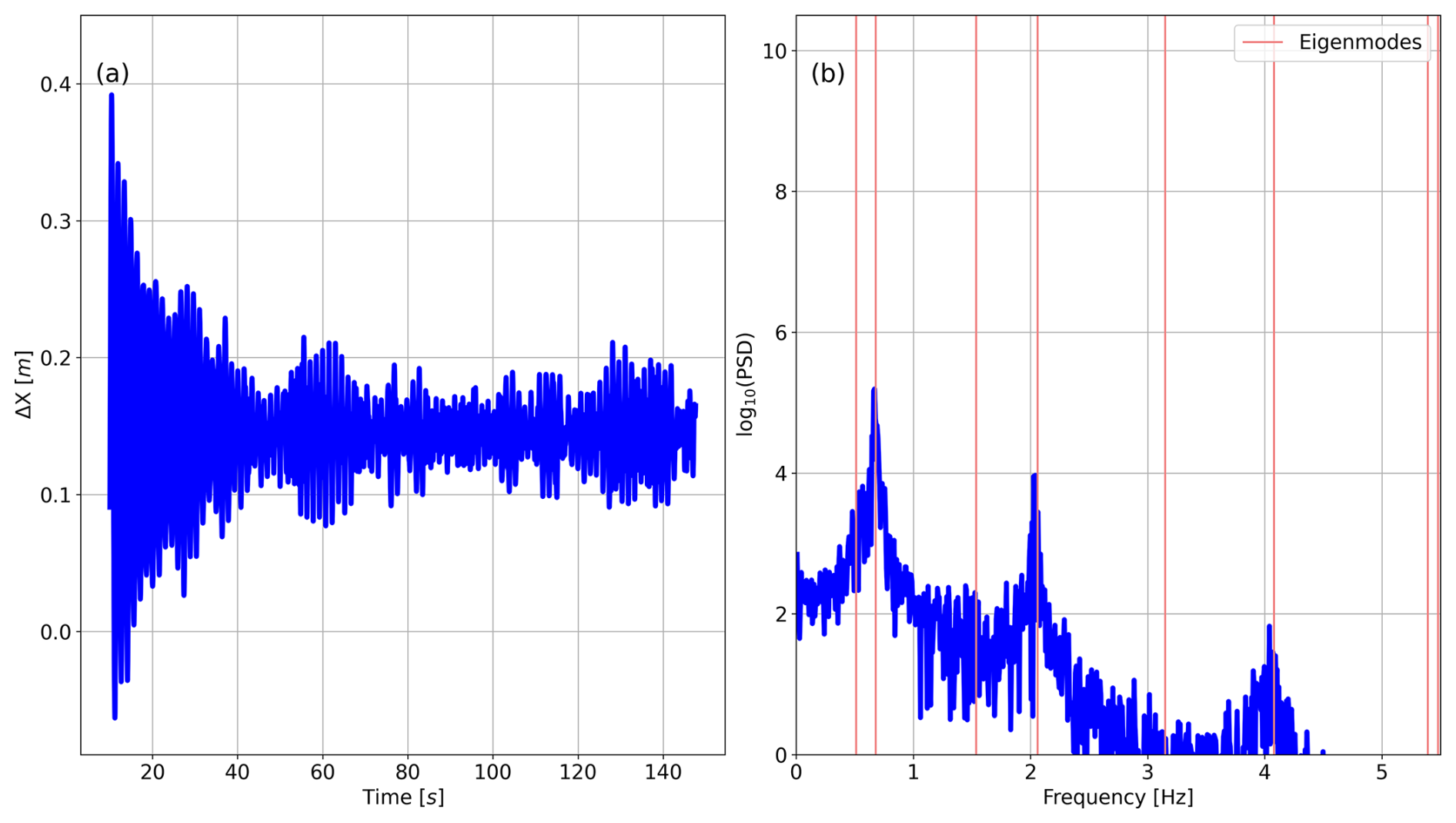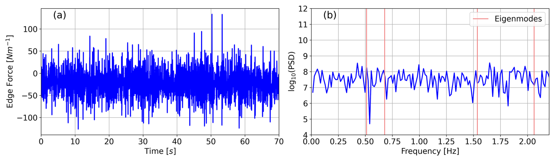 Figure 17Edgewise sectional force signal (a) and power spectrum (b) at for case RIG37. The vertical lines indicate the blade’s eigenmodes. From low to high, the first and third frequencies correspond to the first two flapwise eigenfrequencies, and the second and fourth correspond to the first two edgewise eigenfrequencies.