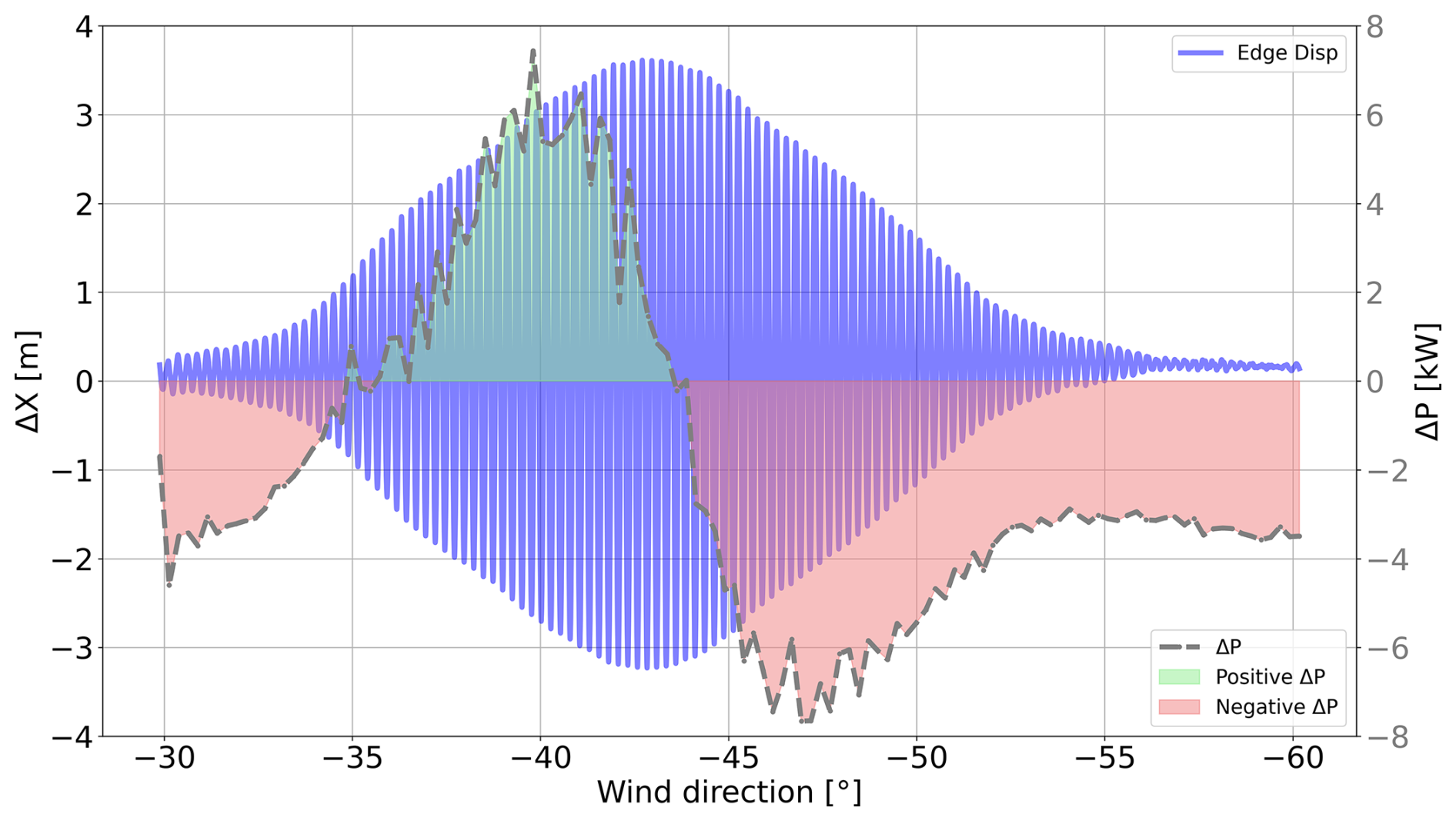 The largest ΔP that is calculated as 7.5 kW is reached at −40° in the regime of growing blade vibration amplitude. This is mirrored during the damping phase of the vibration at −47° yaw misalignment and kW. The largest tip displacement is reached at −43°, where PAERO and PSTRUC seem to be balanced out at ΔP≈0 kW.