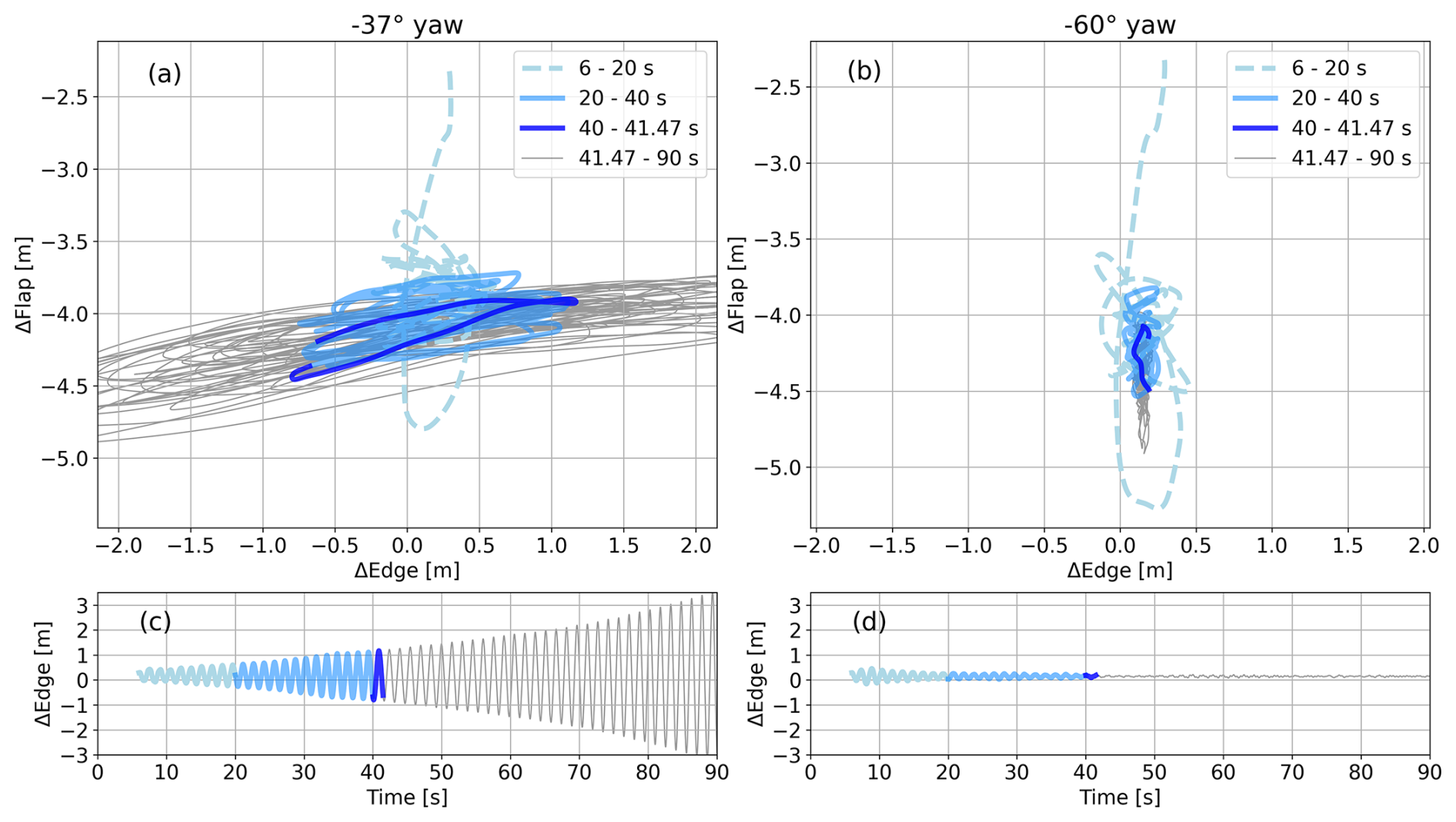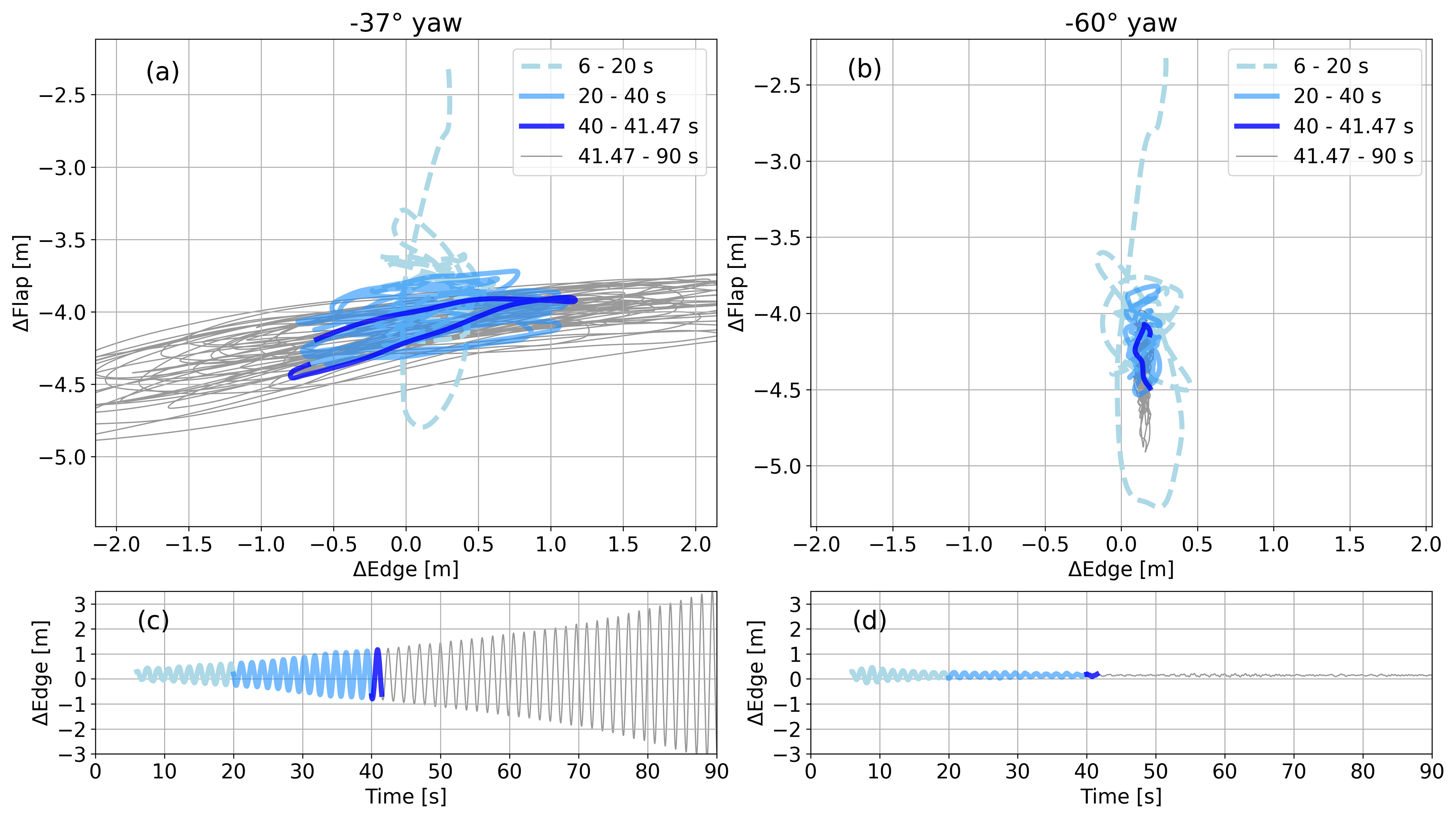 In conclusion, depending on the yaw misalignment configuration, i.e., −37 or −60°, the flow can either amplify or dampen the blade vibrations, underlining the importance of understanding these dynamics from both the fluid dynamics and structural perspectives. Therefore, Sect. 3.2.3–3.2.5 provide a detailed interpretation of these differences.