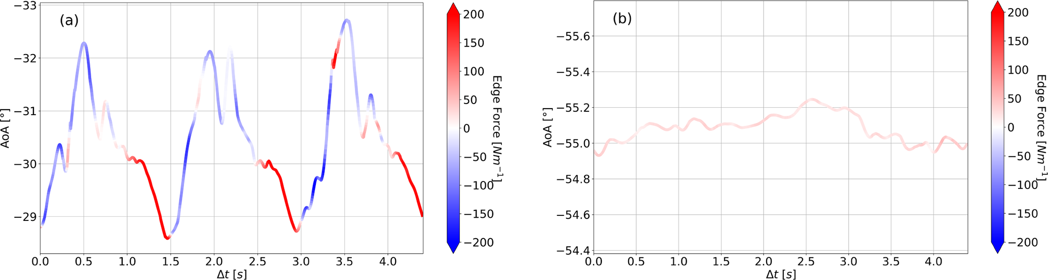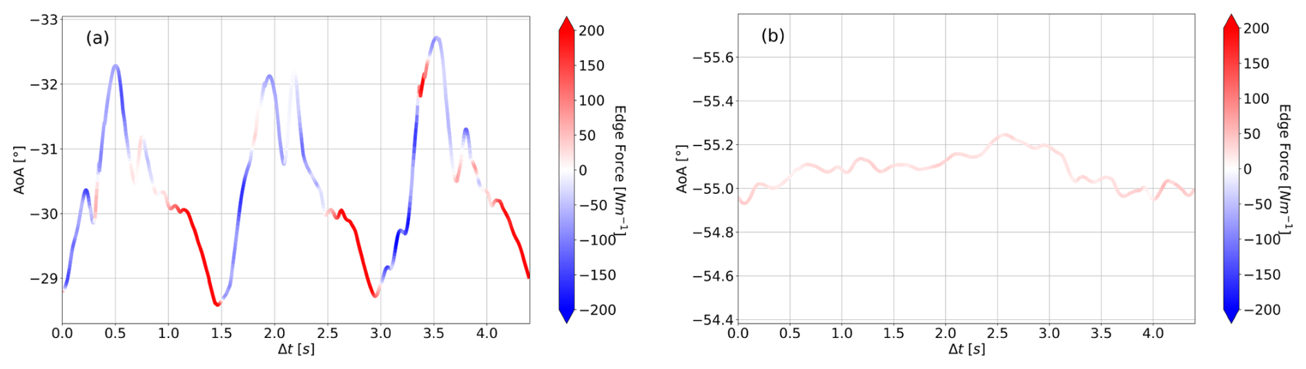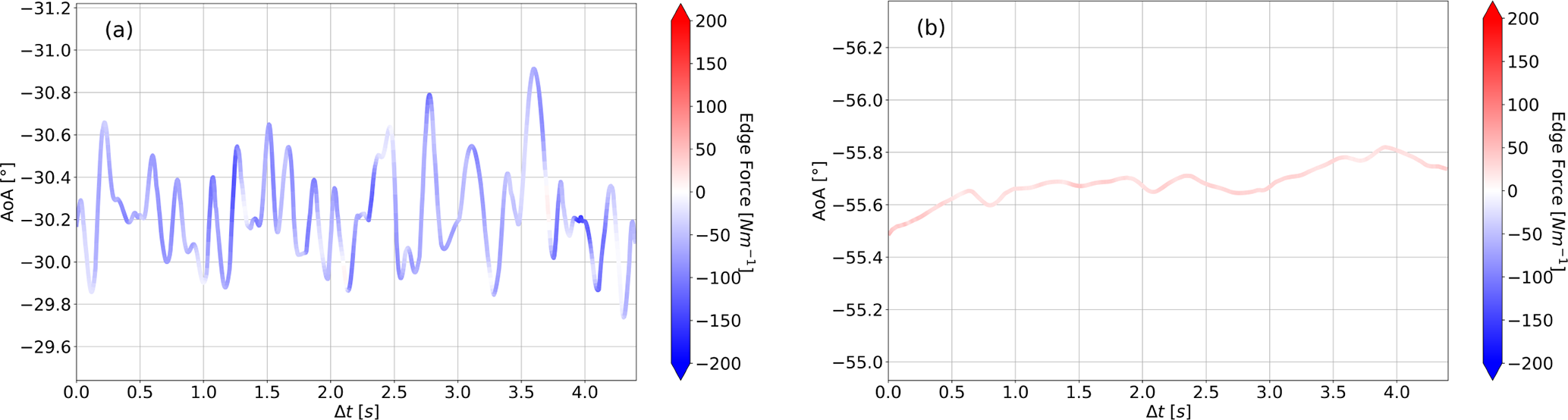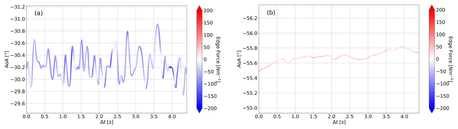 Figure 13 shows the angle of attack time series of the two rigid cases using the three-point method introduced by Rahimi et al. (2018). On the one hand, for case RIG37 in Fig. 13a, the angle of attack fluctuates around −30.2° by amplitudes in the range of ±0.5°. The color-coding depicts the corresponding aerodynamic edgewise force, summed from the pressure and friction forces. Blue corresponds to a force component towards the leading edge, while red points towards the trailing edge. It is visible that, for RIG37, the edgewise force is negative throughout the whole investigated time period, ranging from 0 to −100 N m−1. No connection between the small angle-of-attack fluctuations and the edgewise force is drawn. On the other hand, Fig. 13b shows the angle of attack over time for case RIG60. It is considered to be almost constant at a value of , where minor changes in the predicted edgewise force of 40 N m−1 are also apparent.