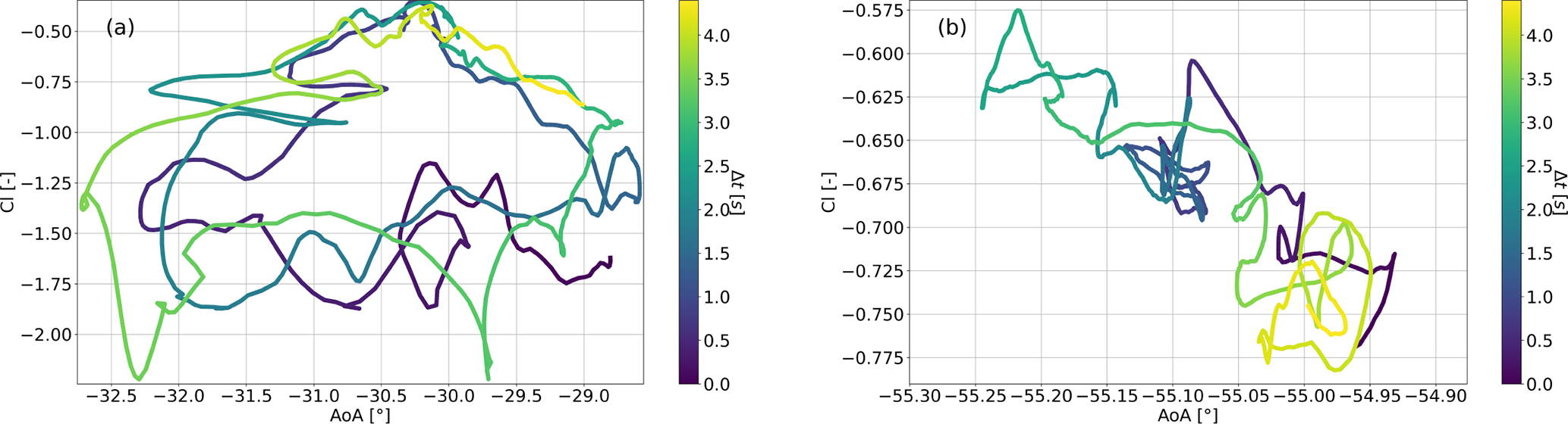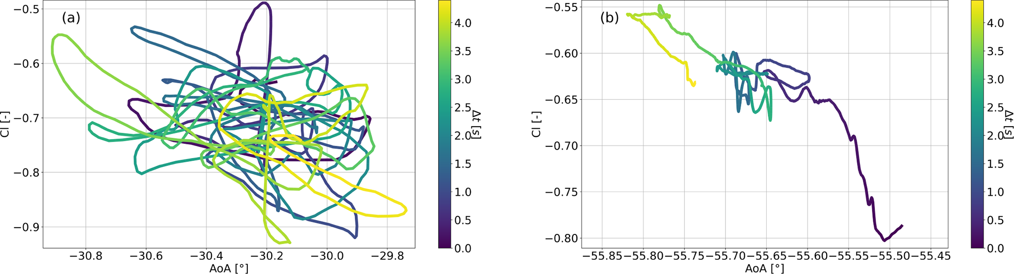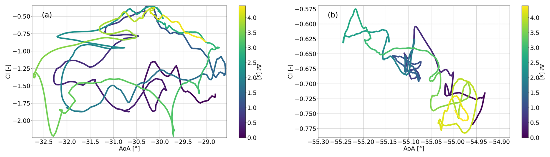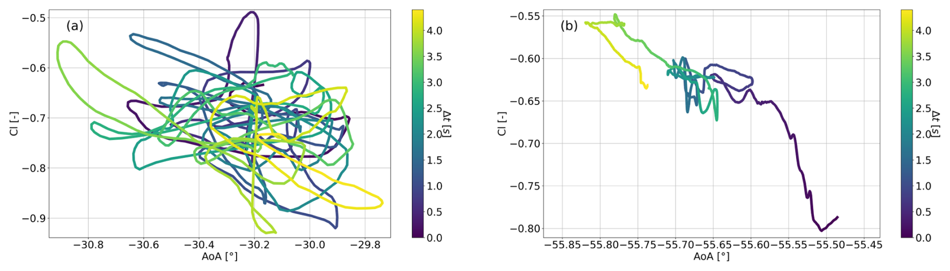 To highlight the connection between lift and angle of attack, Fig. 14 shows the corresponding three theoretical edgewise motion cycle periods for the rigid cases RIG37 and RIG60. Here, the time is color-coded from dark blue to yellow. While the RIG37 describes a more circular pattern for the lift coefficient (Cl) values in the range of , RIG60 shows a linear increasing Cl for decreasing angle of attack and increasing time. Here, Cl values increase from .