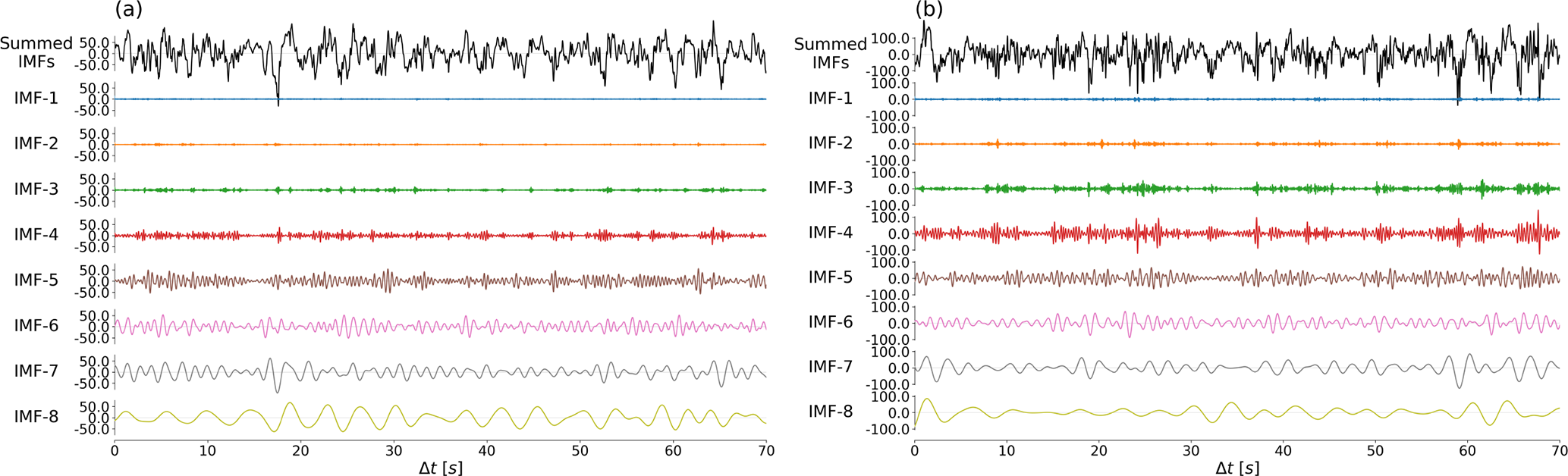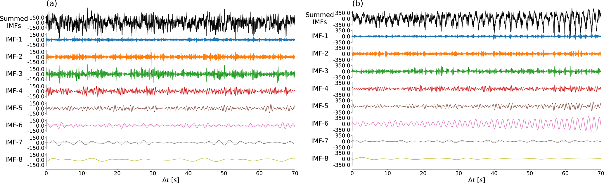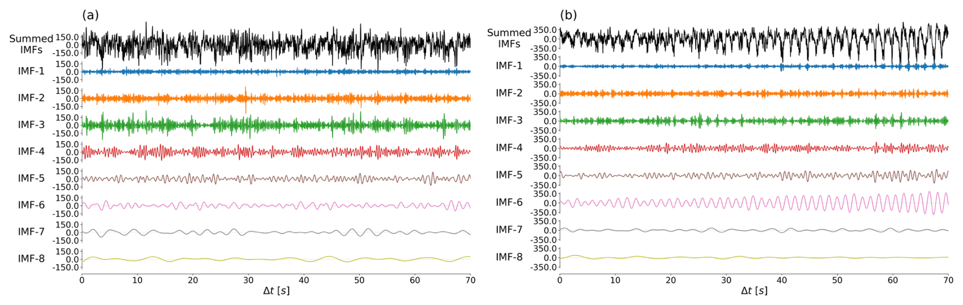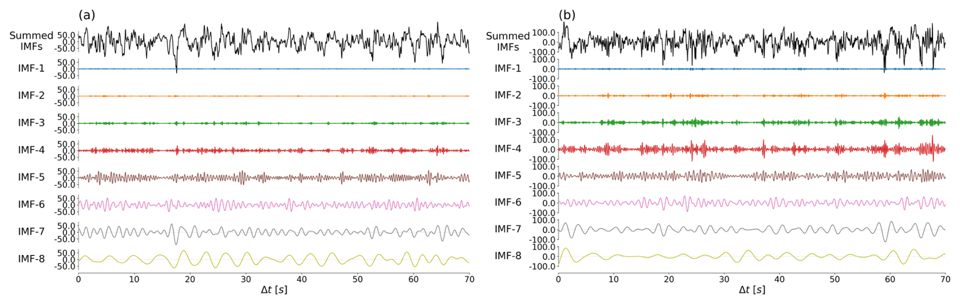 Figure 18Intrinsic mode functions of the edgewise sectional force at for (a) case RIG37 and (b) case FLEX37.