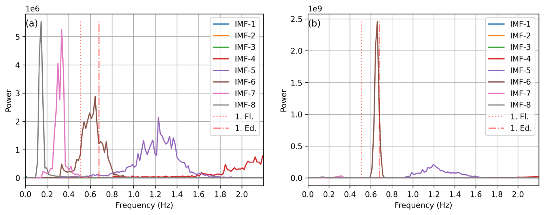 Figure 19Intrinsic mode functions of the edgewise sectional force at for (a) case RIG60 and (b) case FLEX60.