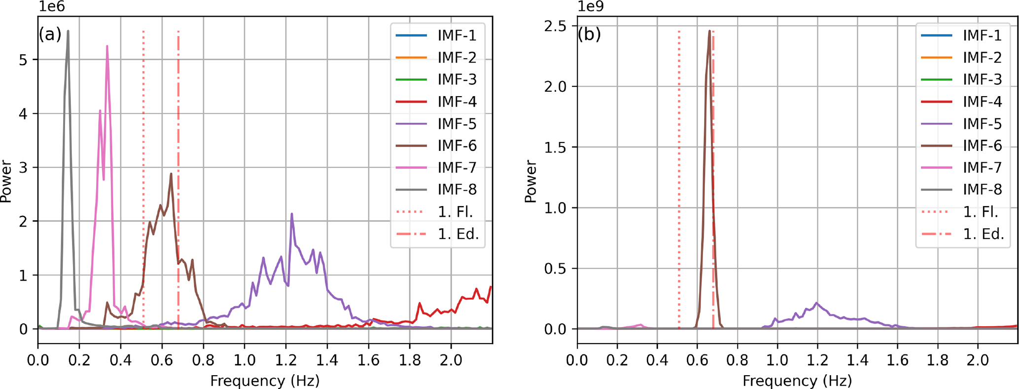 Figure 20Power spectrum of the inherent frequencies of each IMF of the edgewise sectional force at for (a) case RIG37 and (b) case FLEX37. The vertical lines indicate the first two eigenfrequencies of the blade, i.e., first flapwise frequency (1. Fl. – dotted line) and first edgewise frequency (1. Ed. – dashed-dotted line).